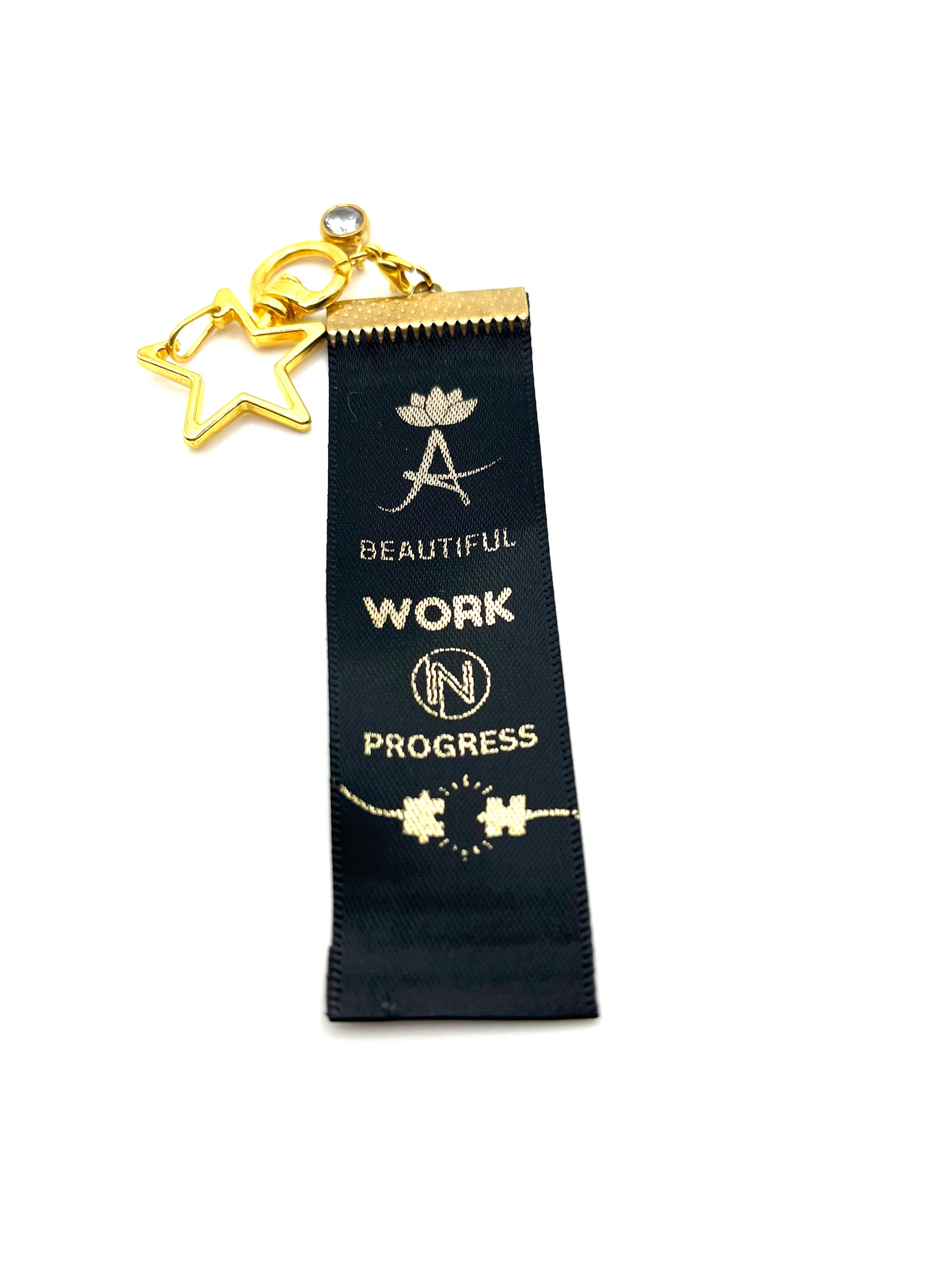 A Beautiful Work in Progress – Inspirational Keychain Gift - – Black Ribbon with Gold Text - Gold Swivel Star Keyring and Gem