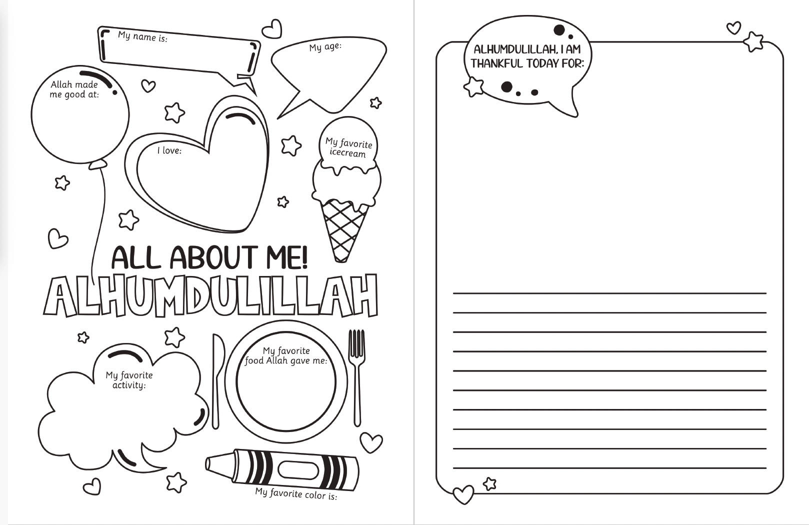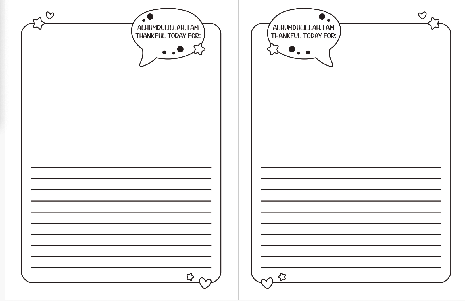 Muslim children's gratitude journal (split pages - top half blank/unlined and bottom half lined)! A great way to get your children to engage in the blessings around them. The first page asks children questions in an animated bubble format (age, name, favourite food, favourite activity etc). After that, each page is split, there is a blank area to colour a picture, and a lined area at the bottom to write about their pictures. This is all within a cute heart frame, which features a speech bubble at the top that says, "I am thankful for...".