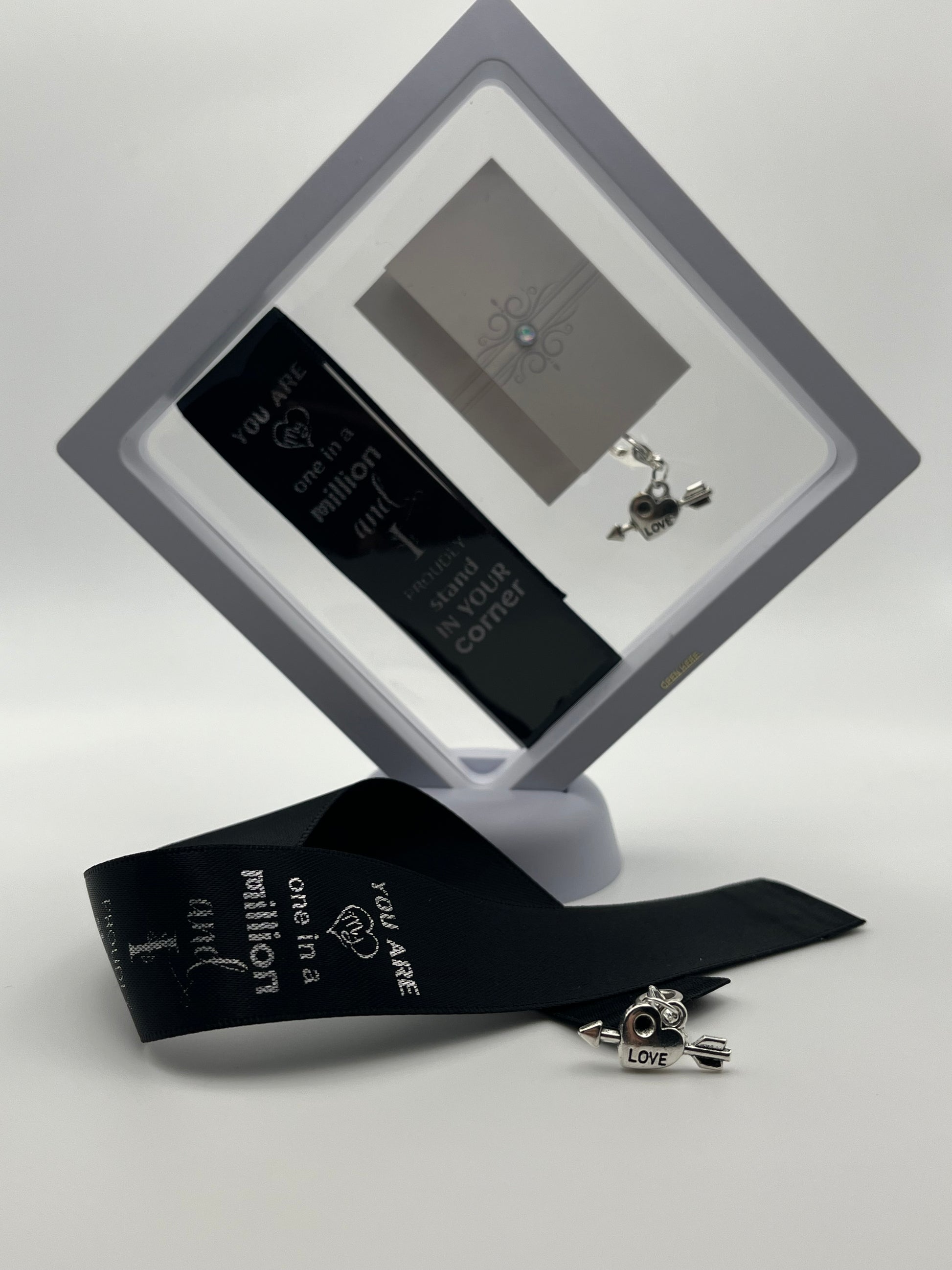 - One 25 mm/2.5 cm wide, black double-sided luxury satin Book-It™ bookmark with a silver-coloured eyelet that says, “You are one in a million and I proudly stand in your corner” written in silver text