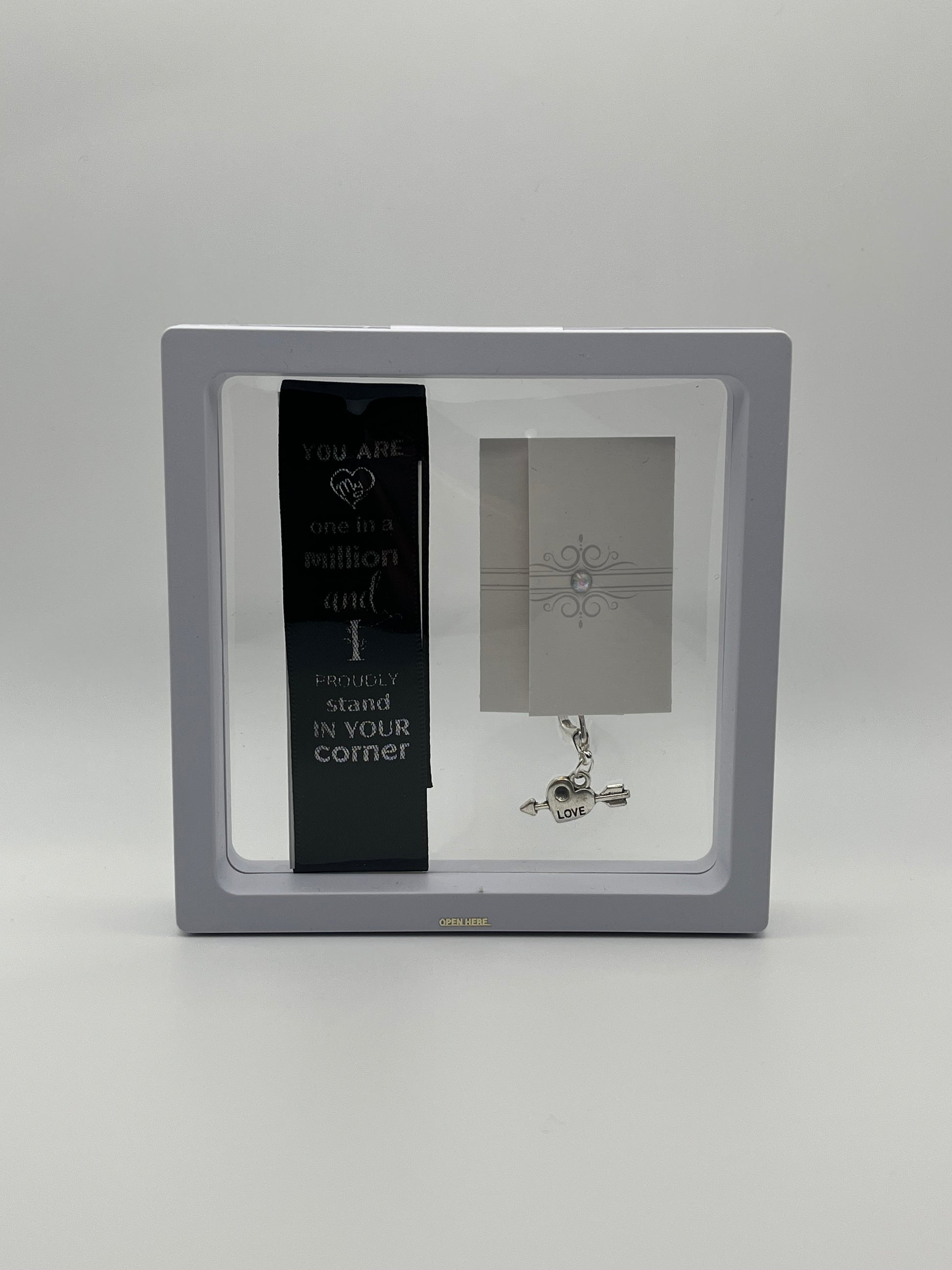 ANNIVERSARY - “You are one in a million and I proudly stand in your corner “- Black Satin Reusable Adhesive Book-It™ Bookmark with a Charm (Heart with Arrow) in Gift Box