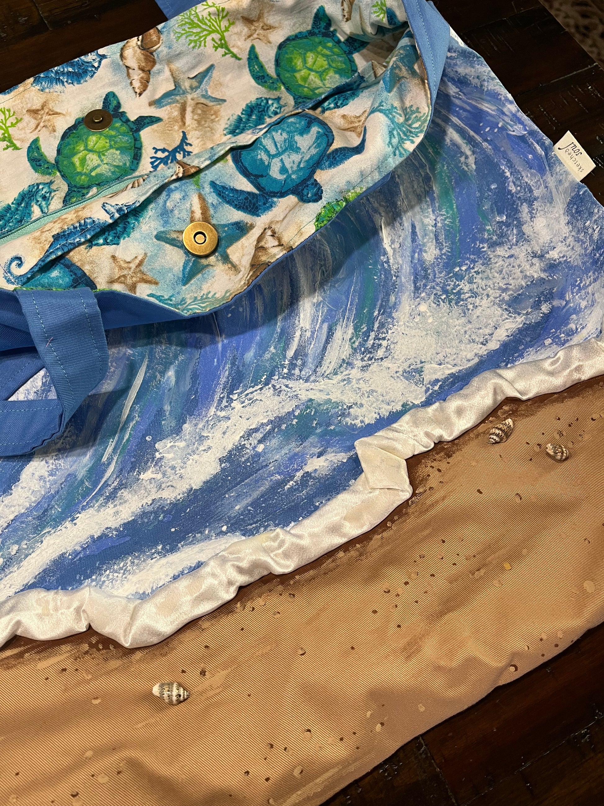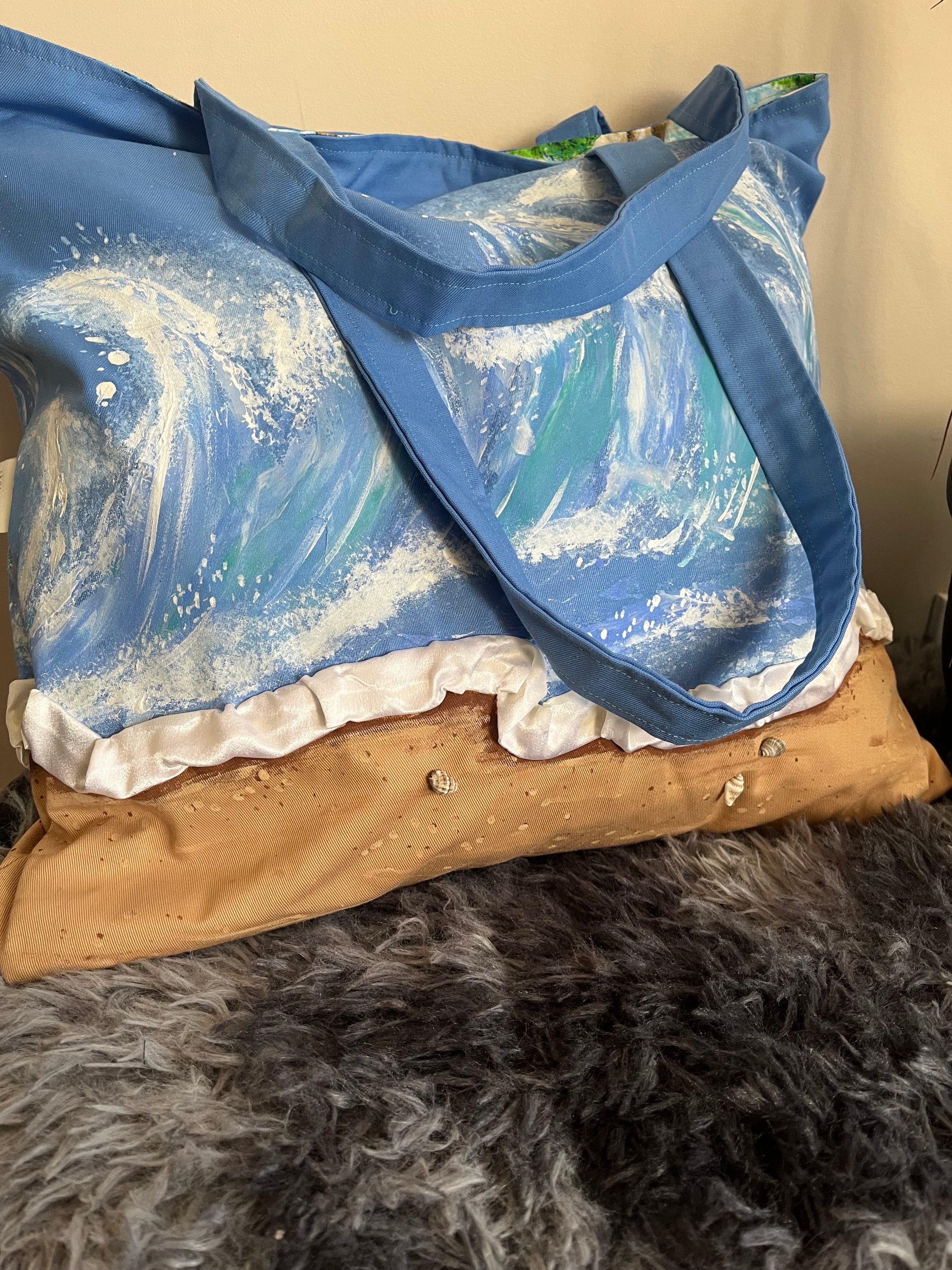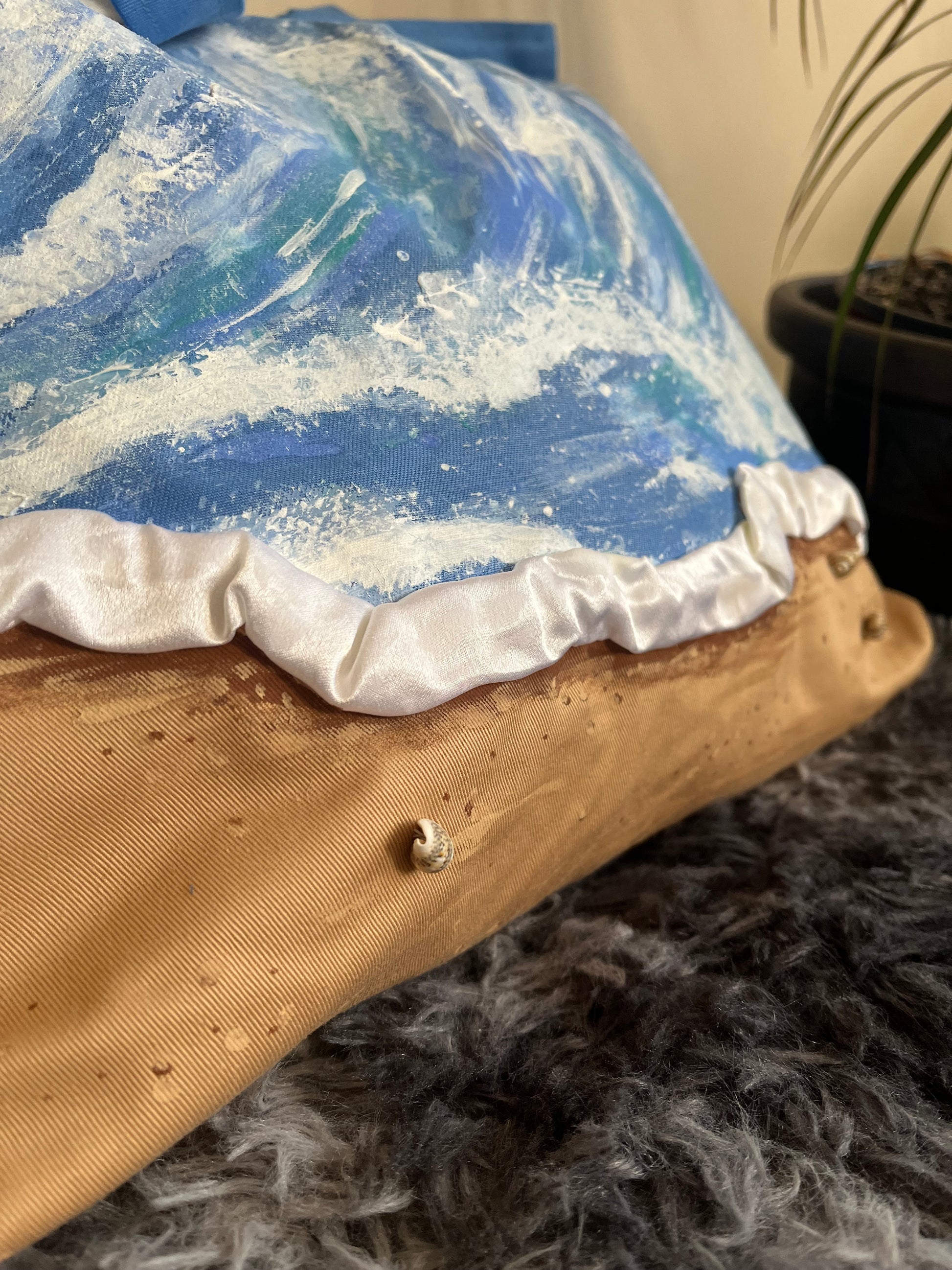 - Large Tote - Hand-Painted Waves, Stitched on Shells and Satin Ocean Foam Line