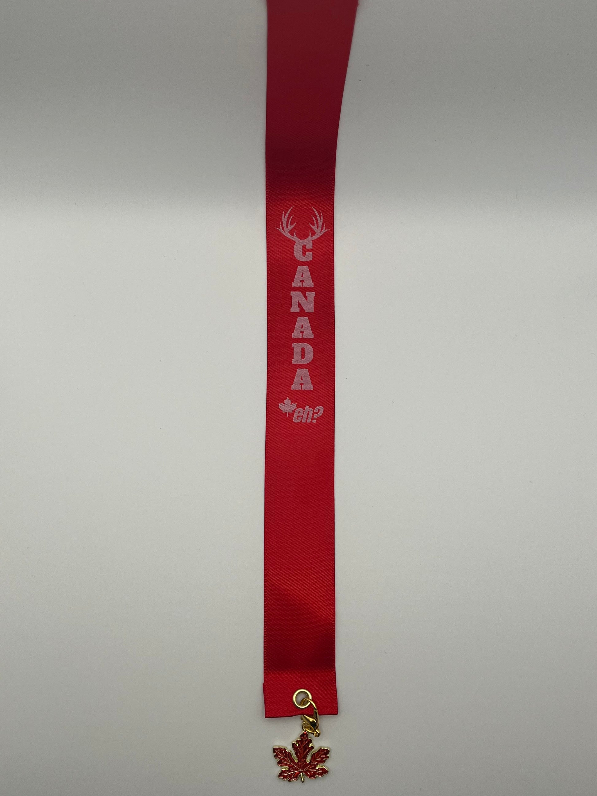 - One 25 mm/2.5 cm wide, red luxury satin bookmark with a gold-coloured eyelet that says, “CANADA, eh? written in white text