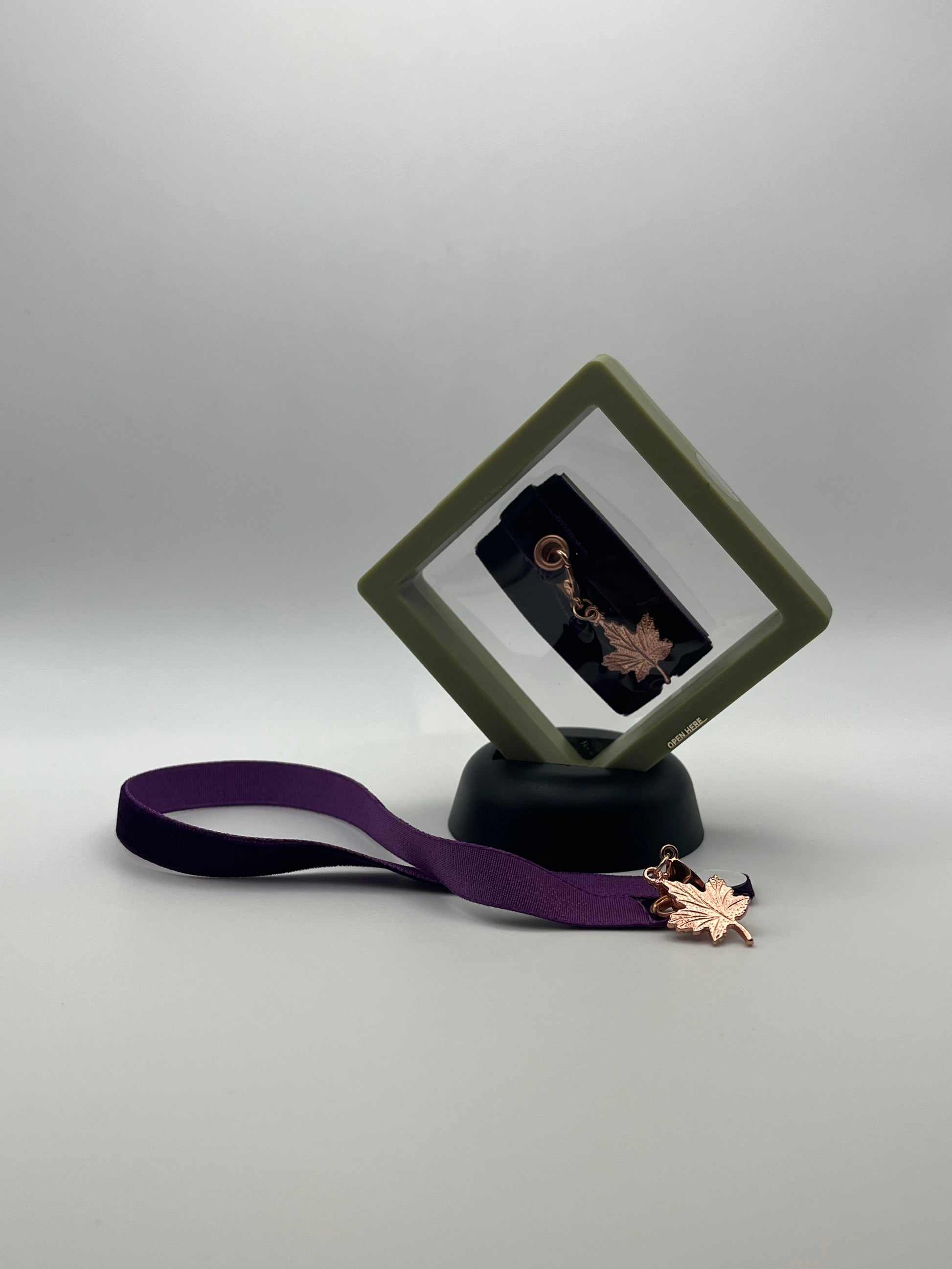 3) Purple velvet ribbon with a rose gold maple leaf charm in a green gift box