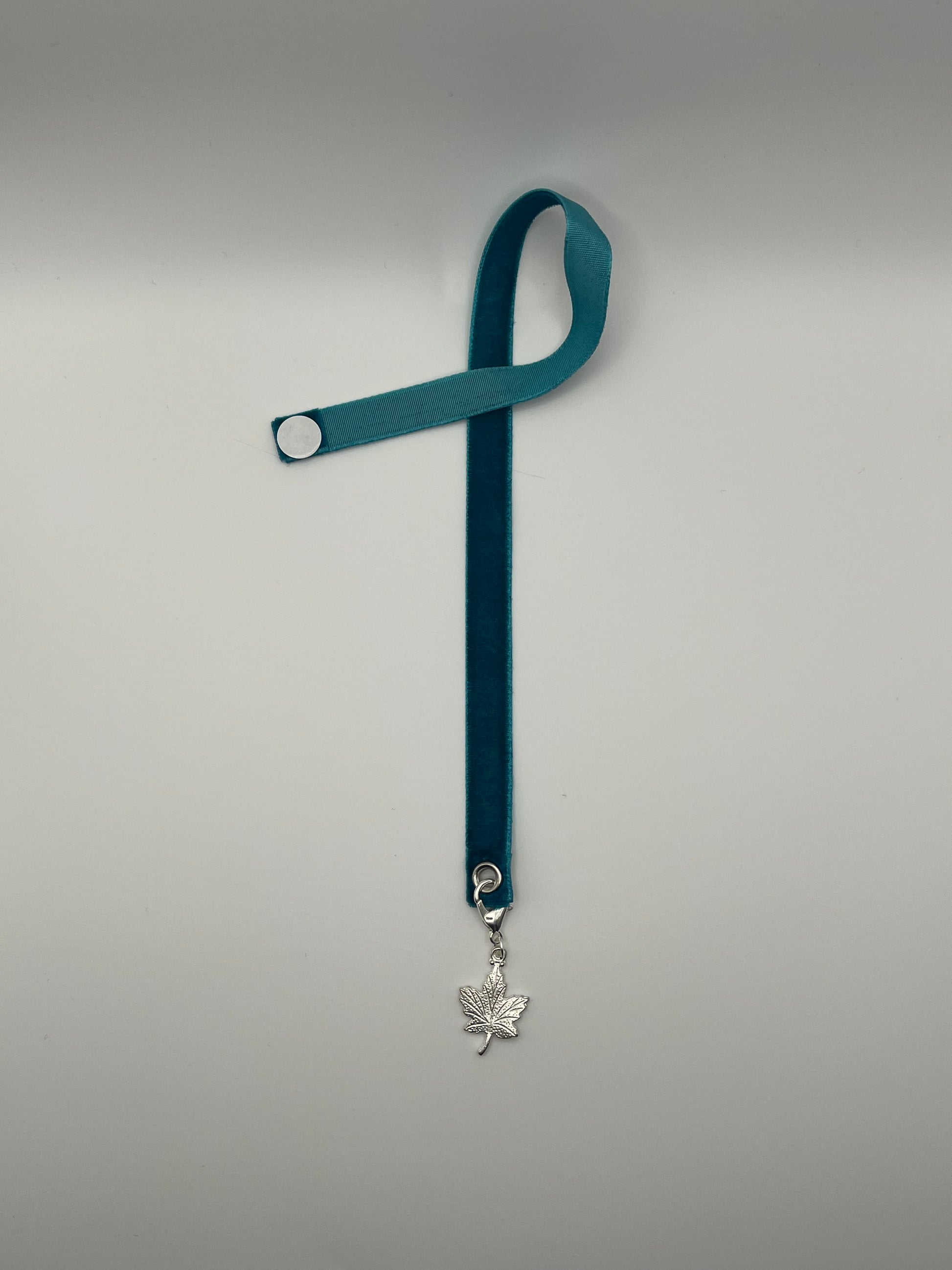 Canadian Maple Leaf – Turquoise Velvet Reusable Adhesive Bookmark with a Charm (Silver Maple Leaf) in a Mini Gift Box