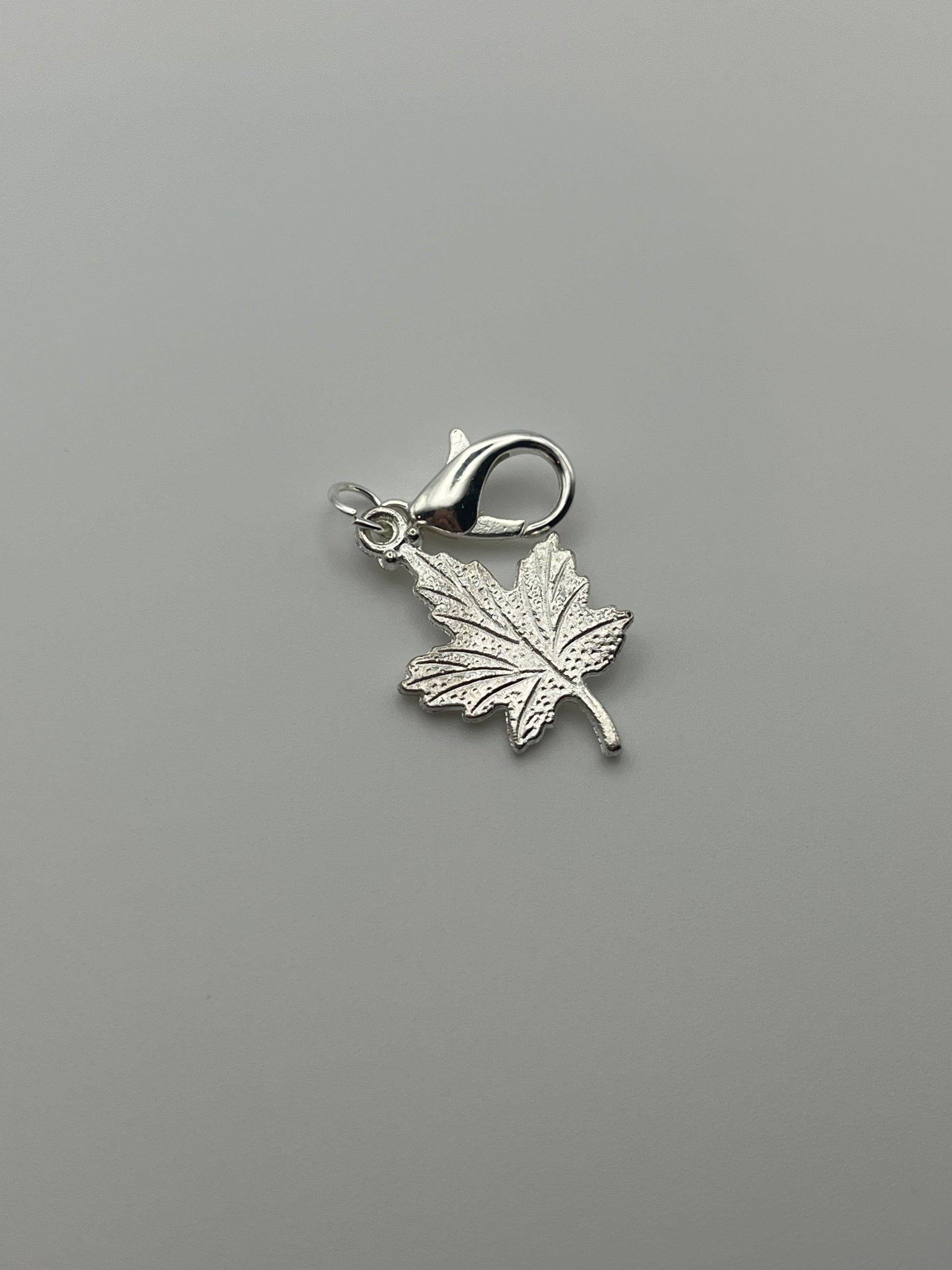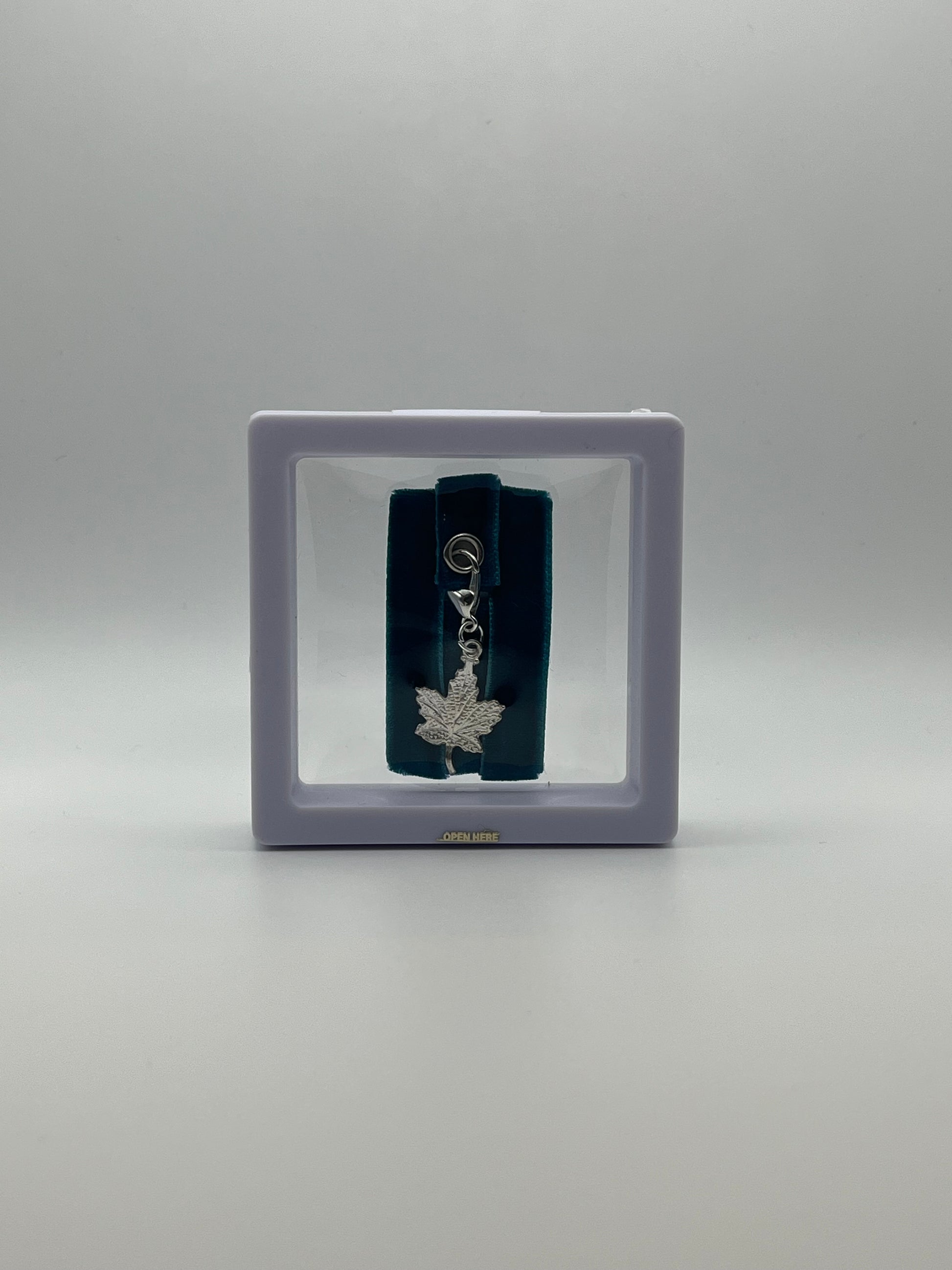 1) Turquoise velvet ribbon with a silver maple leaf charm in a white gift box