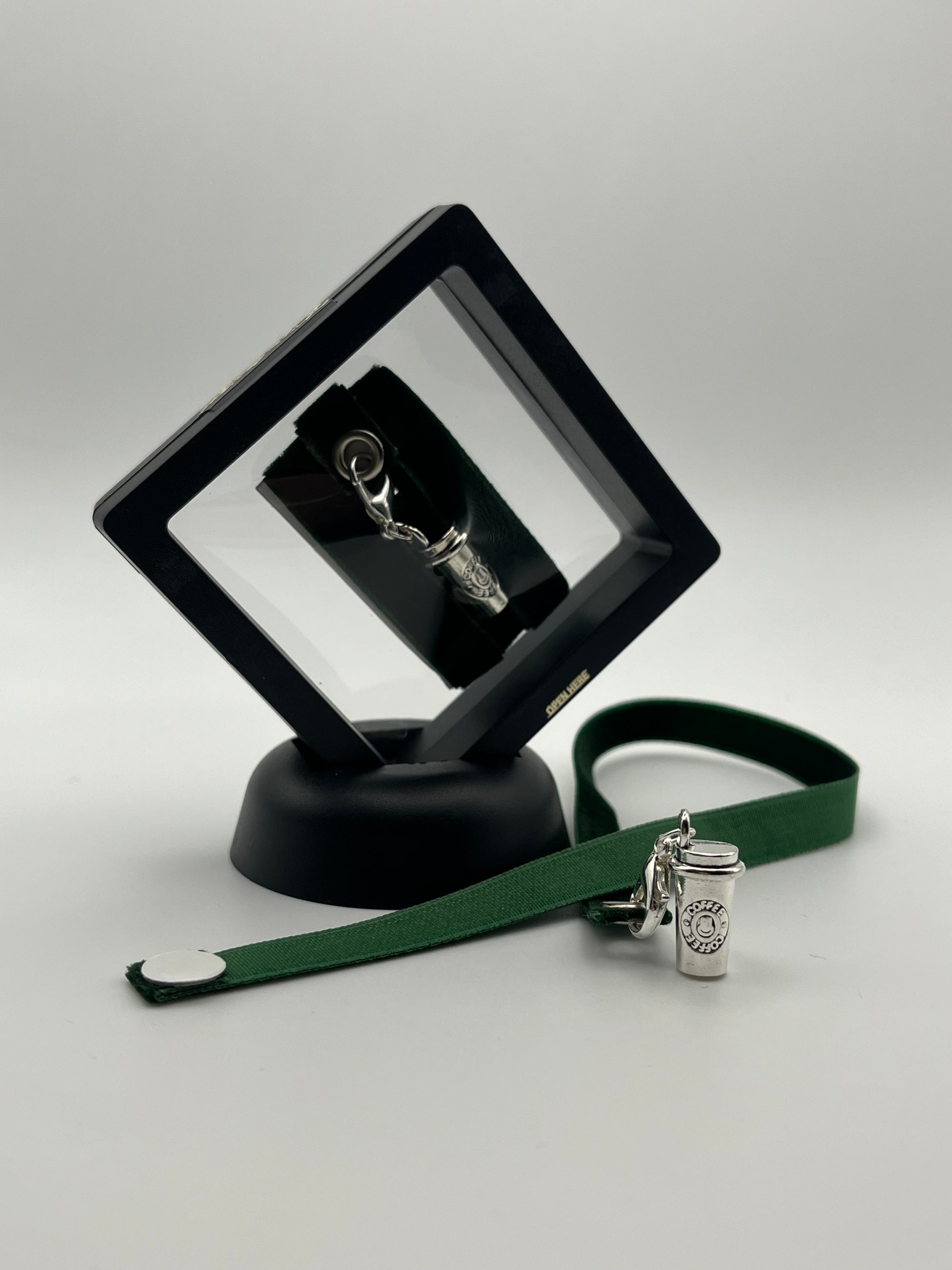 COFFEE CONNOISSEUR – Green Velvet Reusable Adhesive Book-It™ Bookmark with a Charm (coffee travel cup) in a Mini Gift Box
