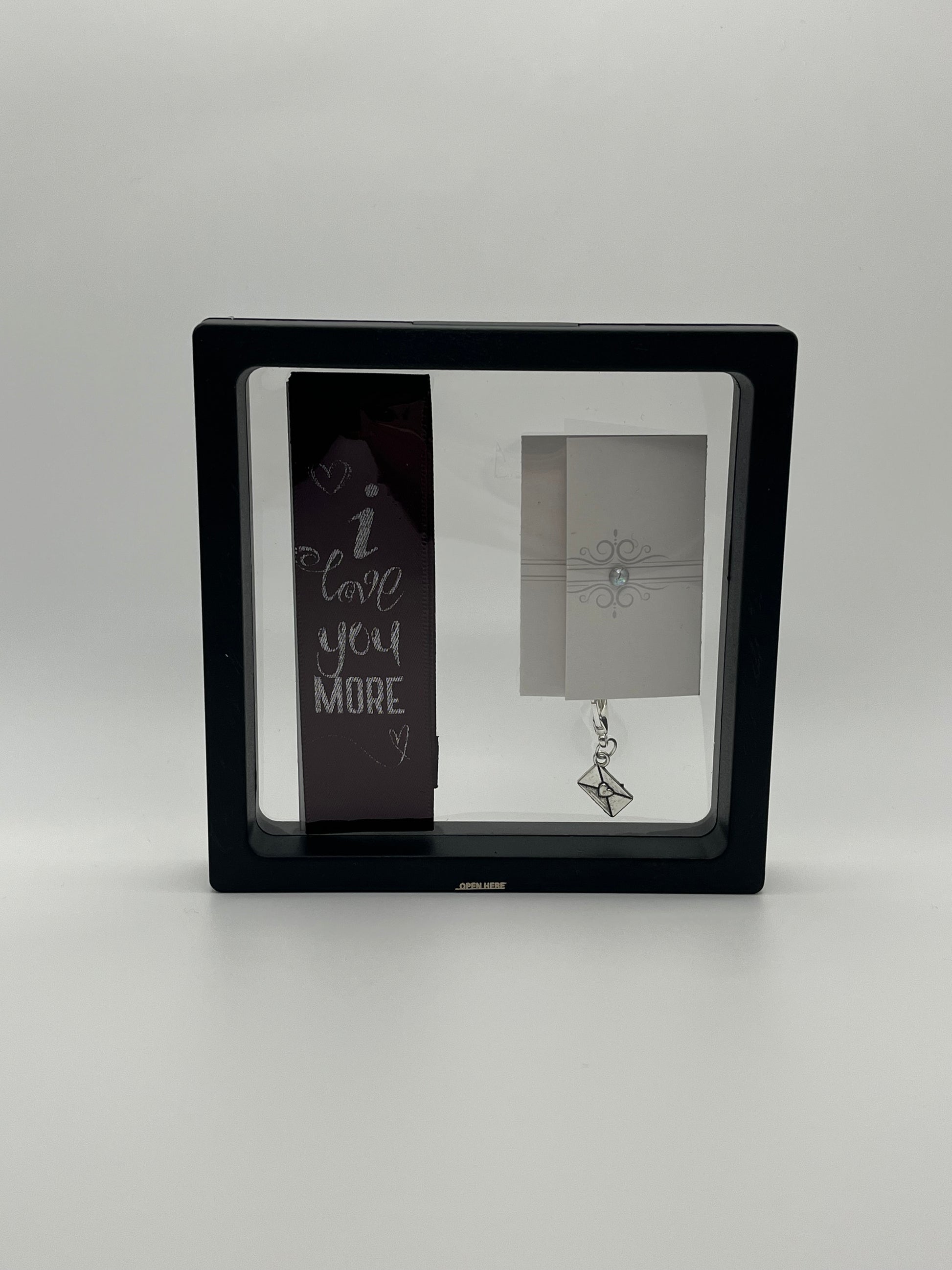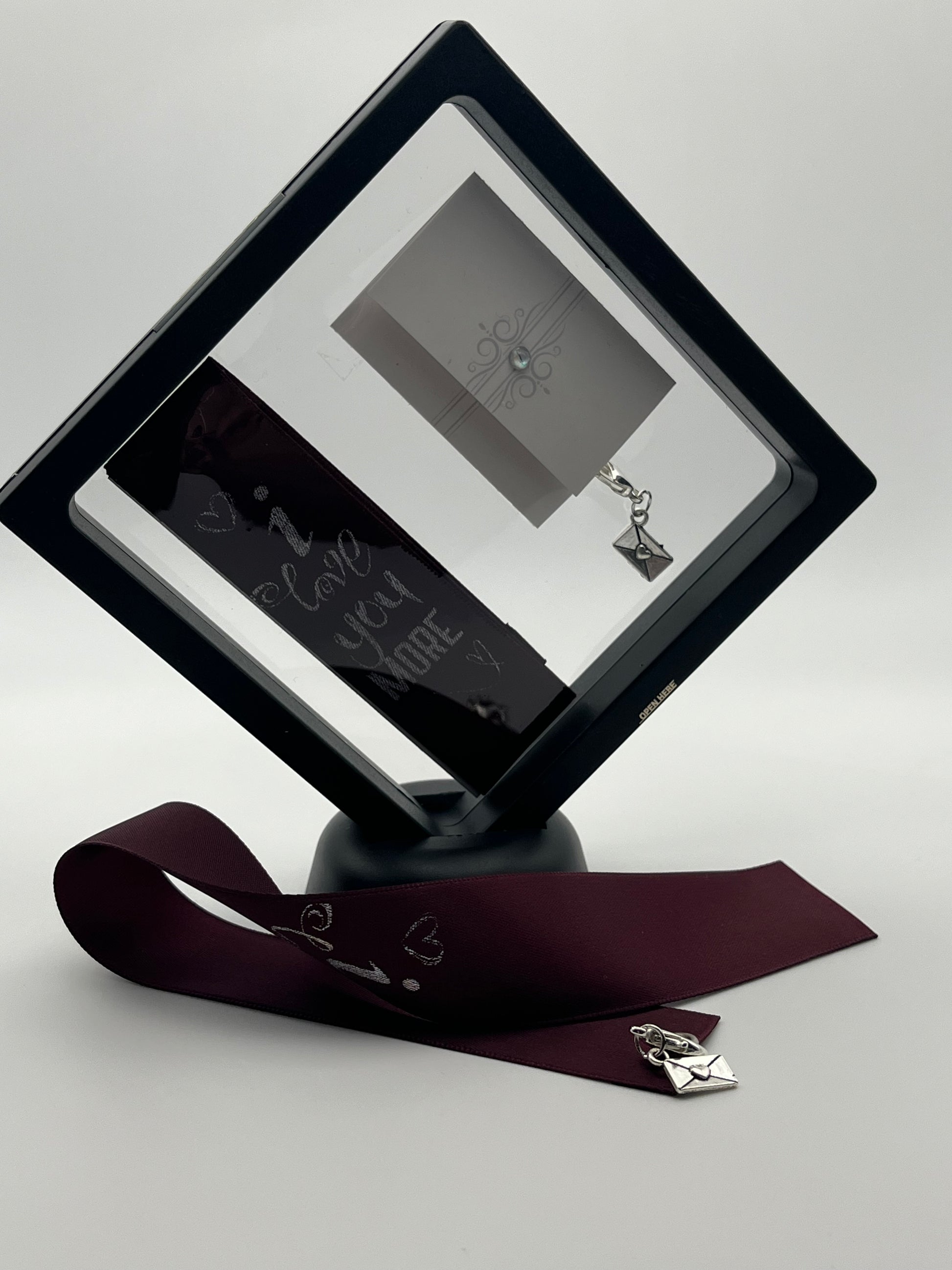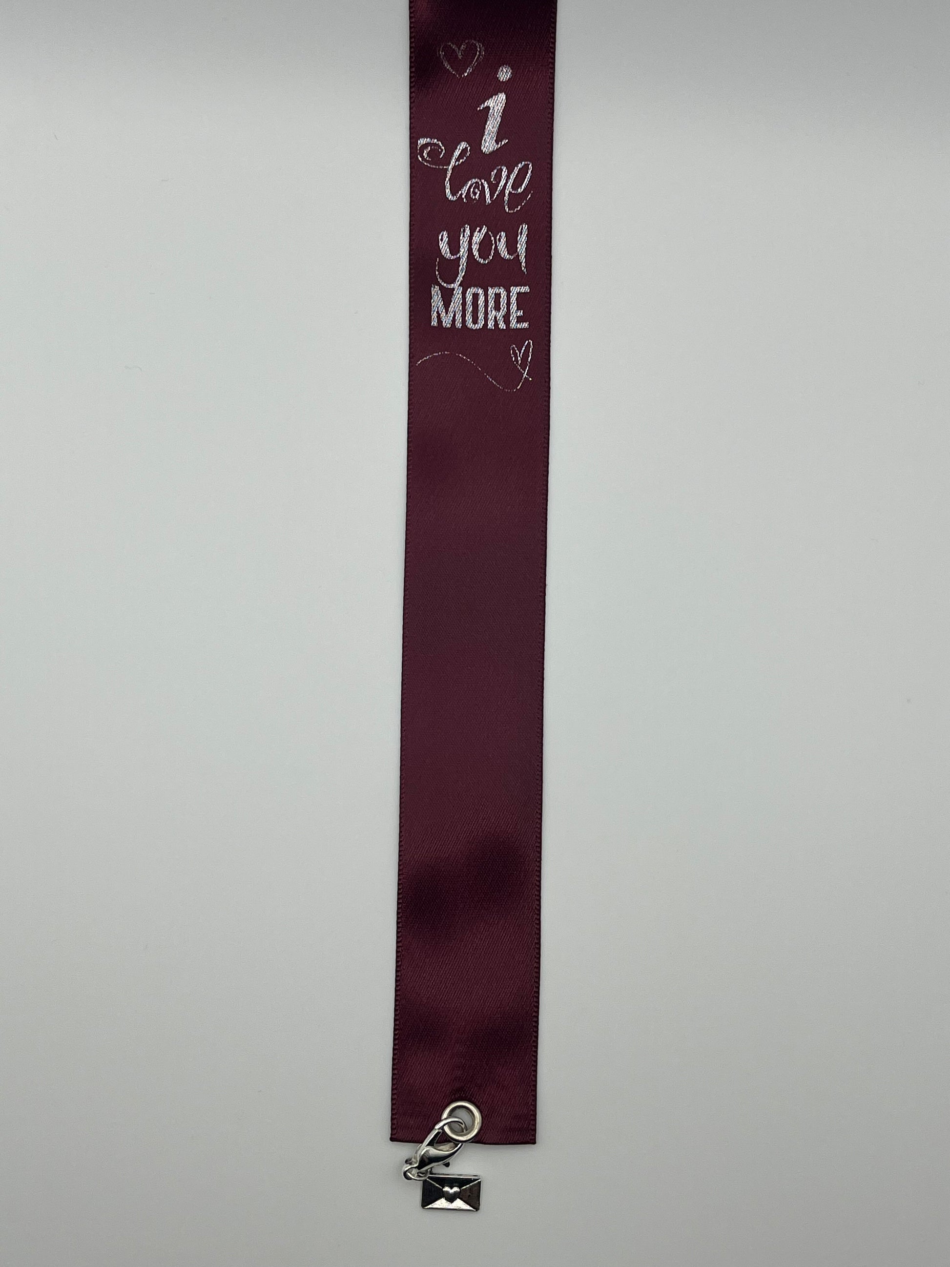 - One 25 mm/2.5 cm wide, plum single-sided luxury satin Book-It™ bookmark with a silver-coloured eyelet that says, “I love you more” written in silver text
