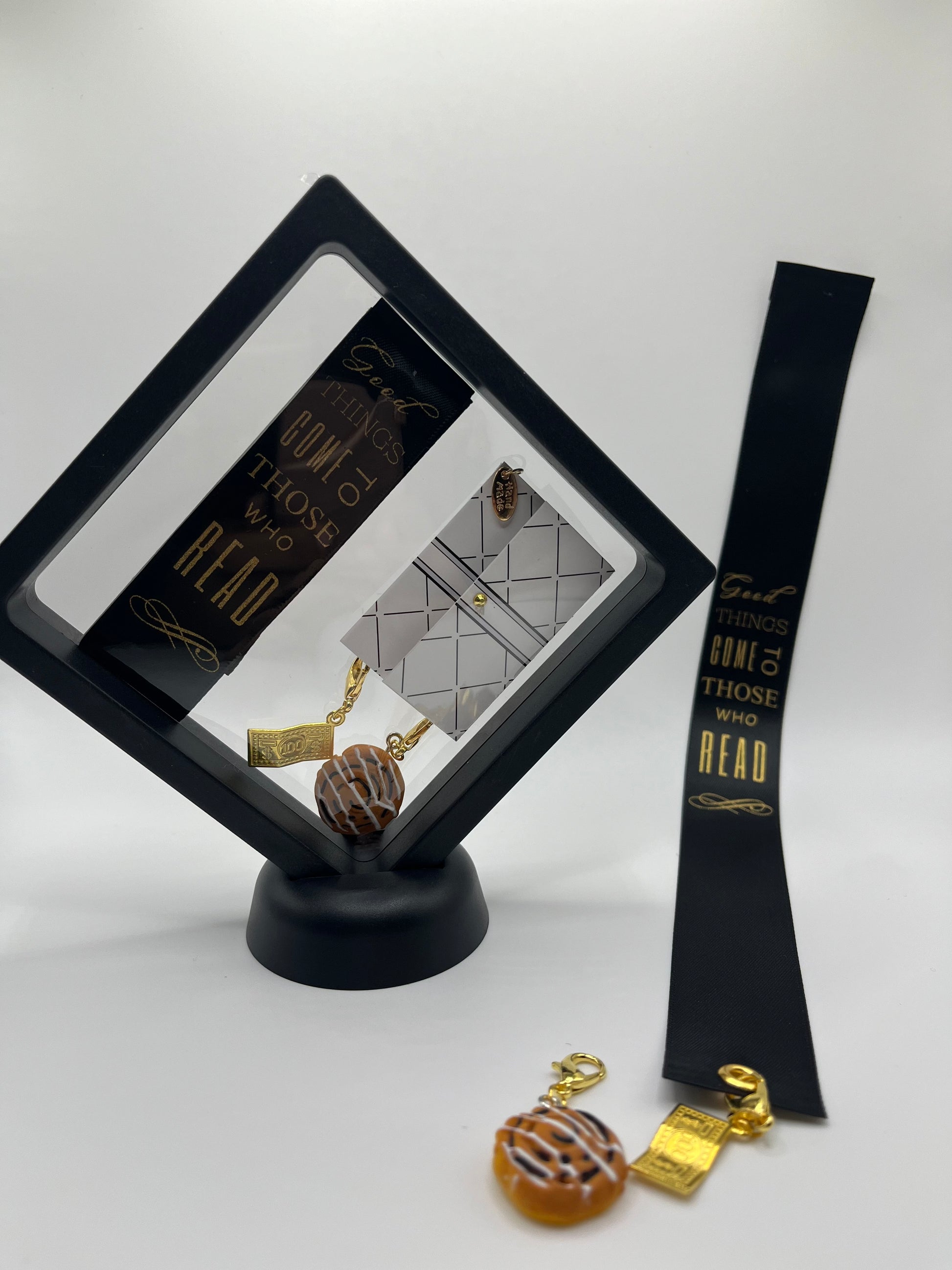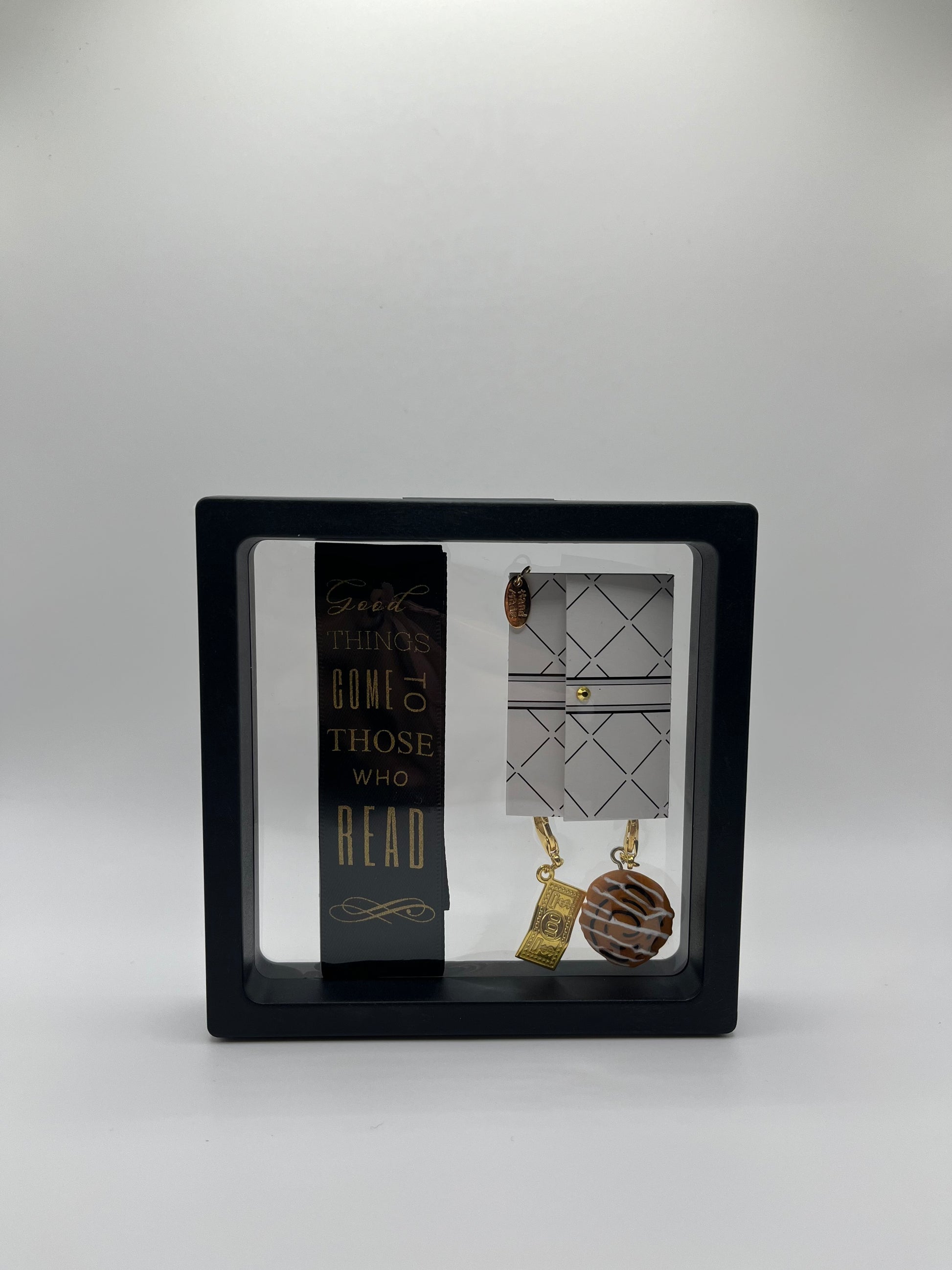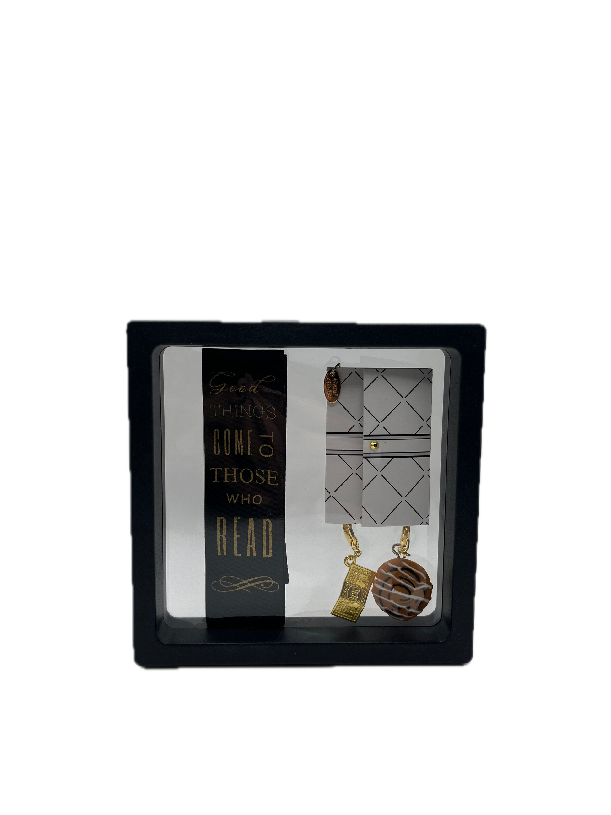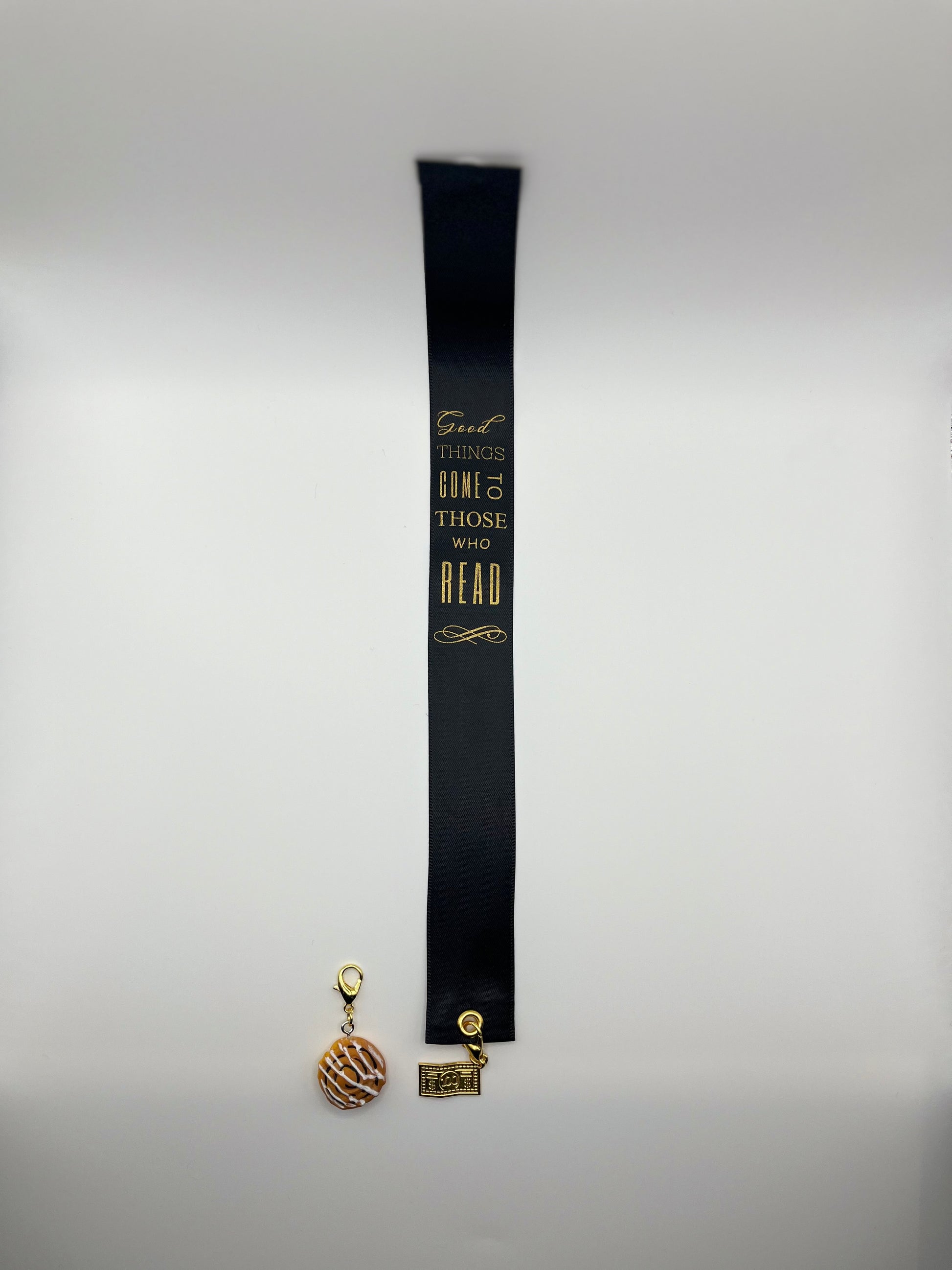 "Good Things Come to Those Who Read" – Black Satin Reusable Adhesive Book-It™ Bookmark with Two Charms in Gift Box + Hidden Scratch Gift Message