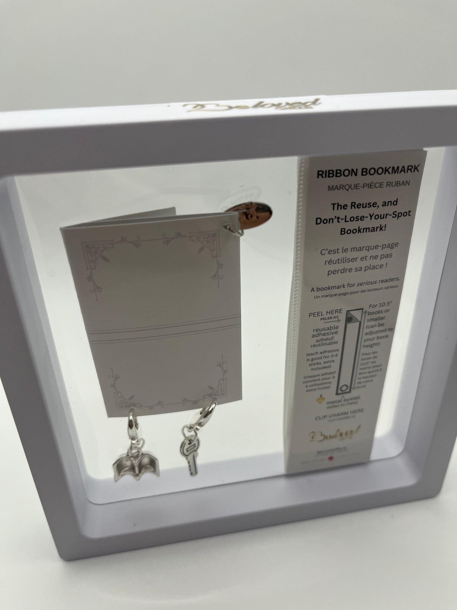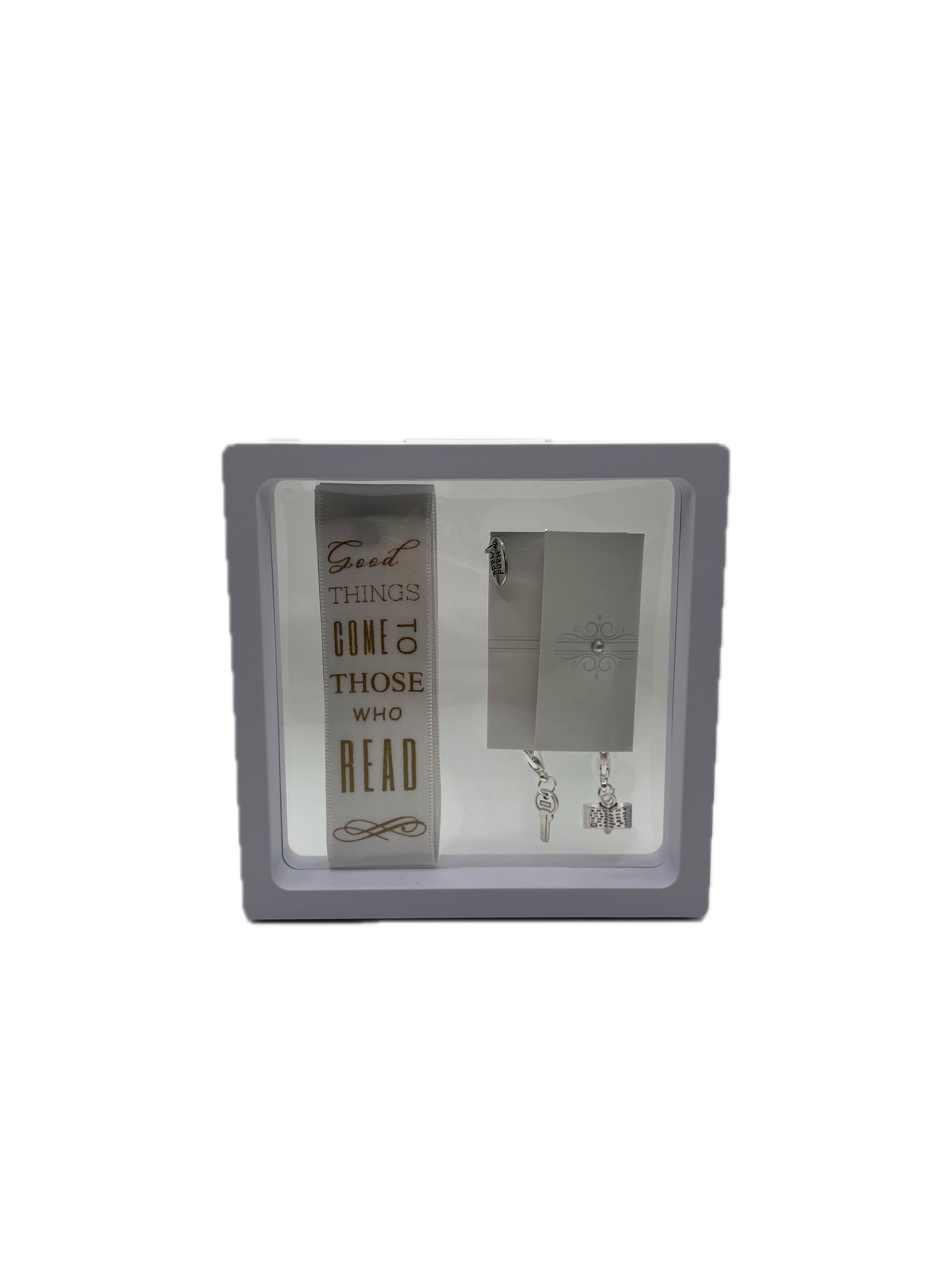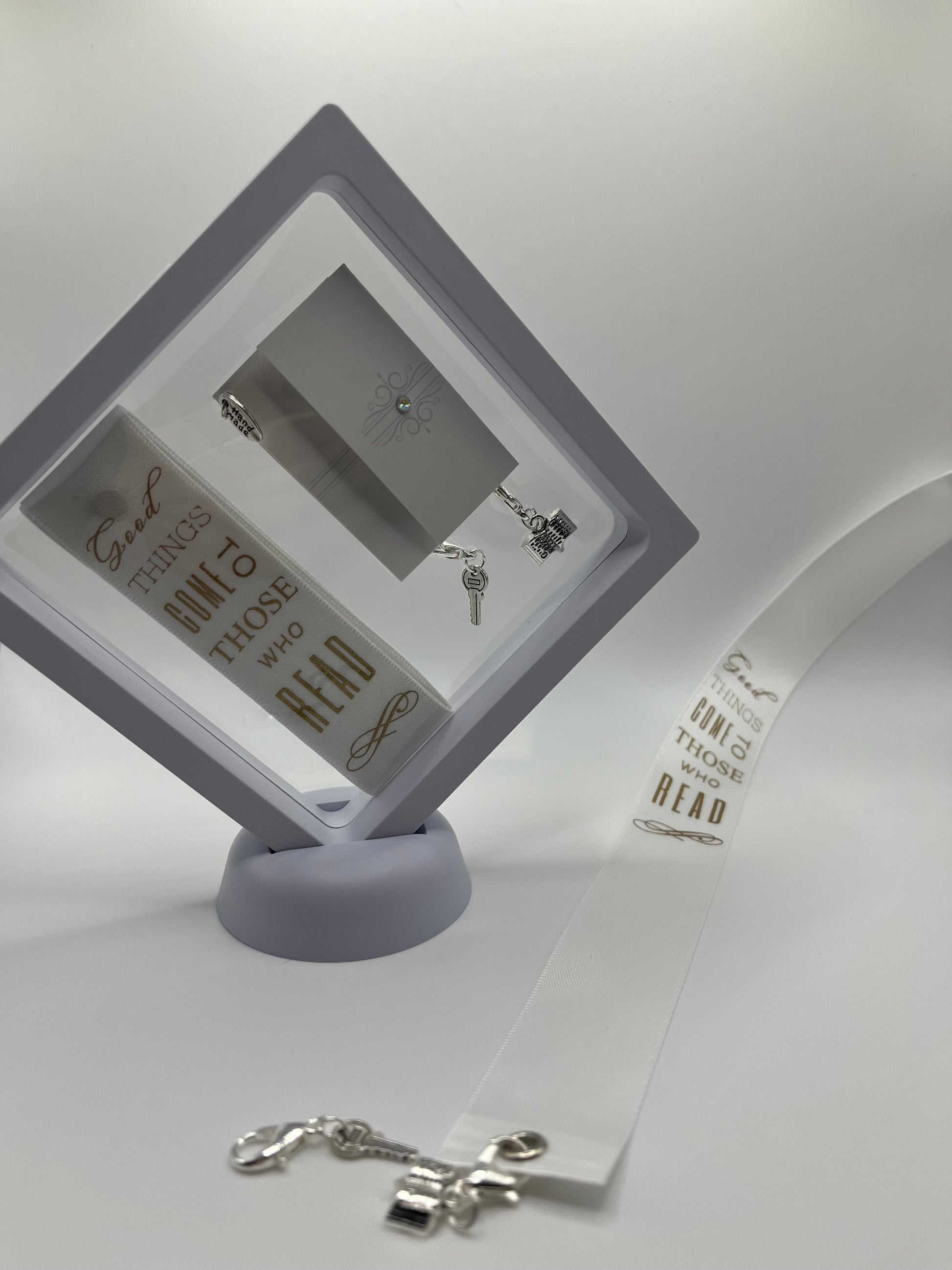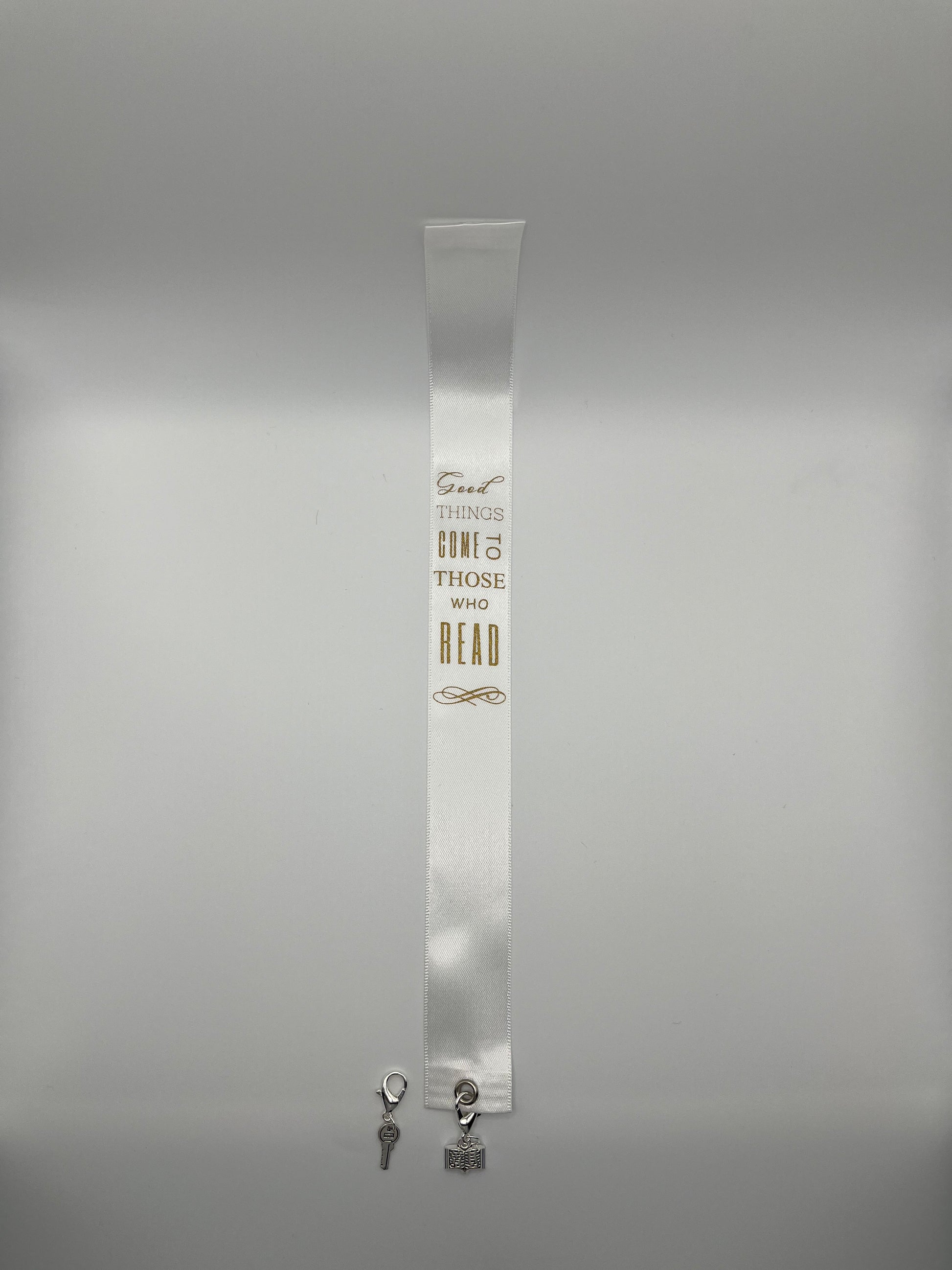 "Good Things Come to Those Who Read" – White Satin Reusable Adhesive Book-It™ Bookmark with Two Charms in Gift Box + Hidden Scratch Gift Message