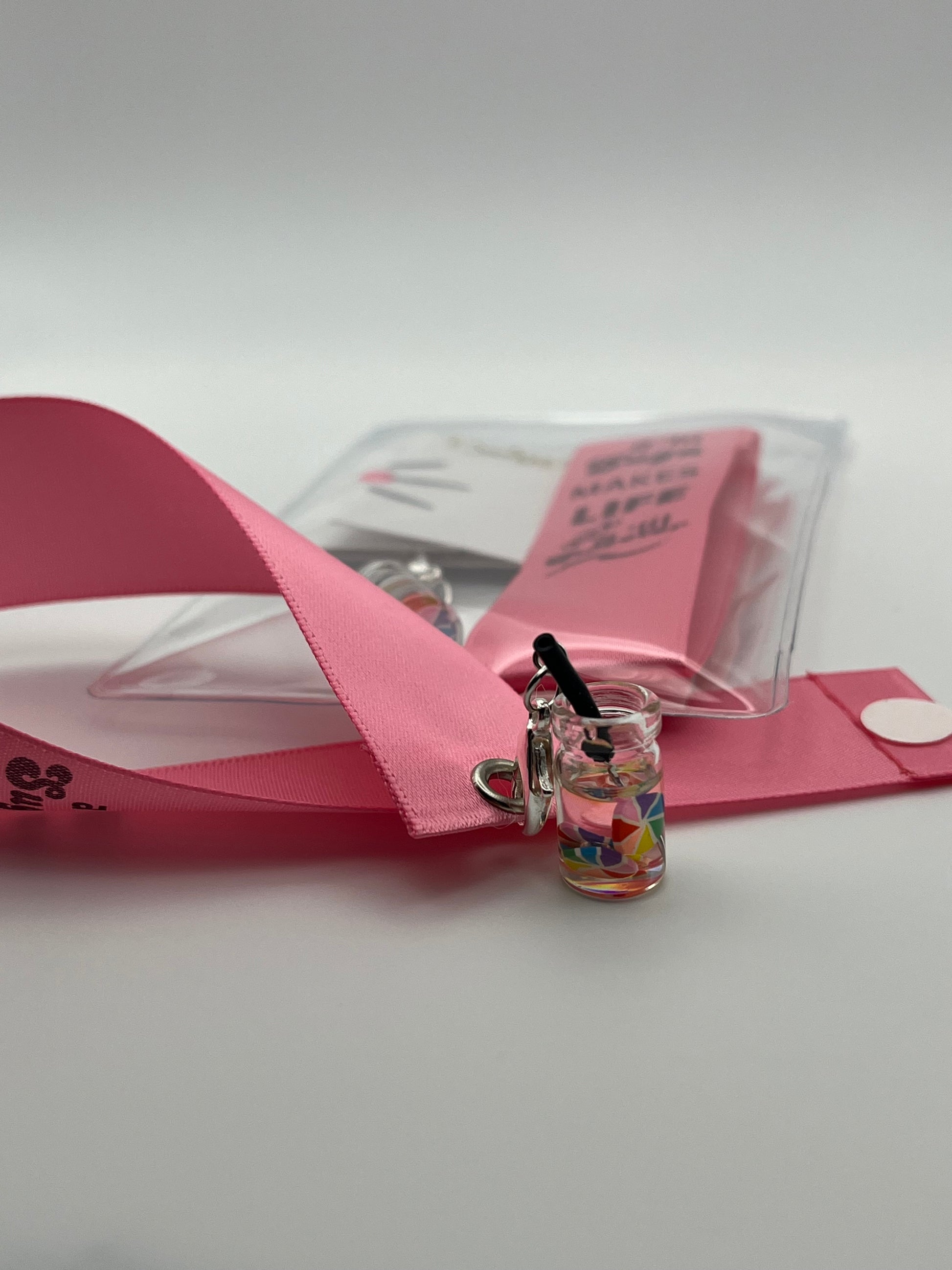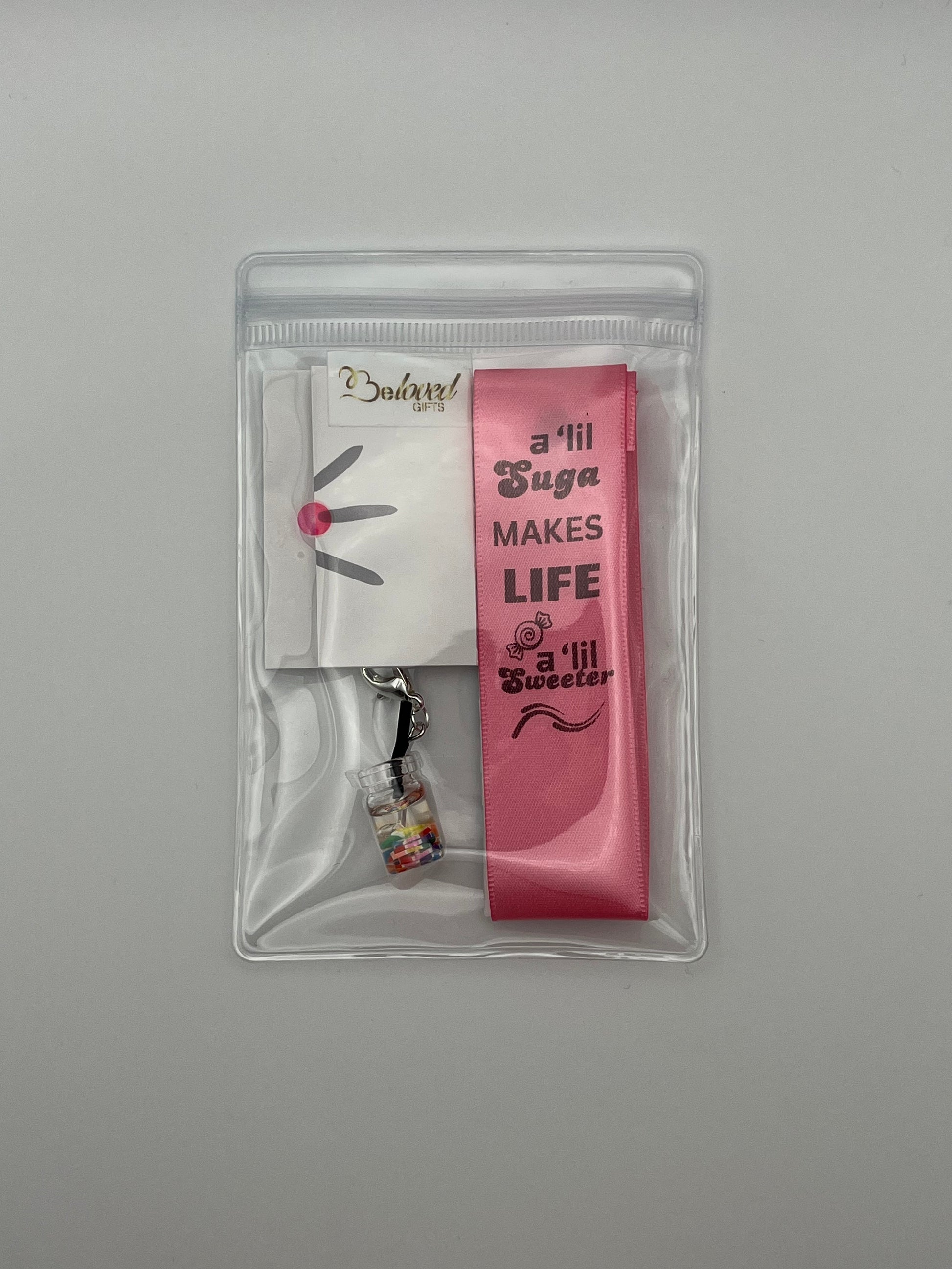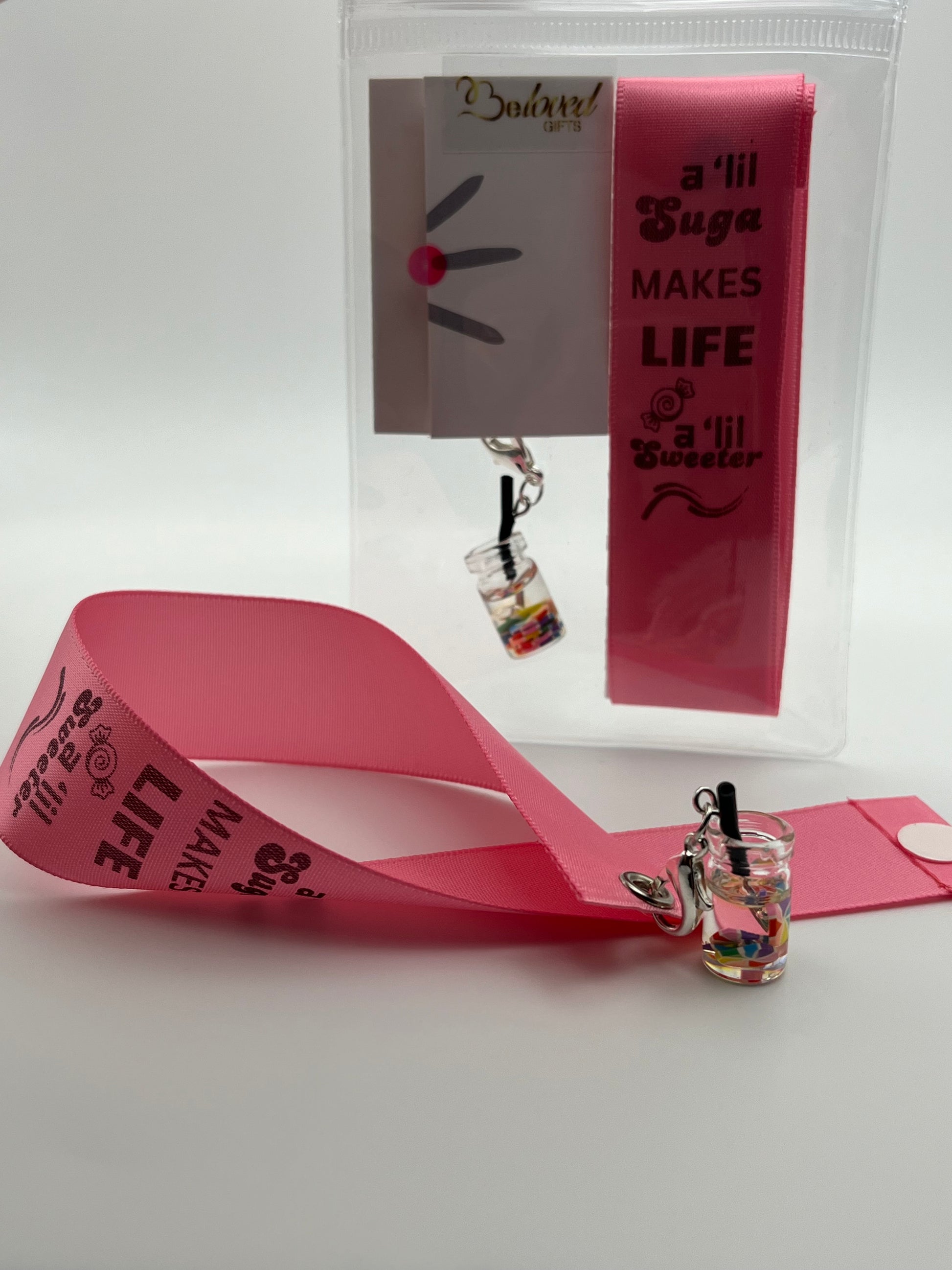- One 25 mm/2.5 cm wide, pink single-sided satin Book-It™ bookmark with a silver-coloured eyelet that says, “A ‘lil suga makes life a ‘lil sweeter” written in grey text