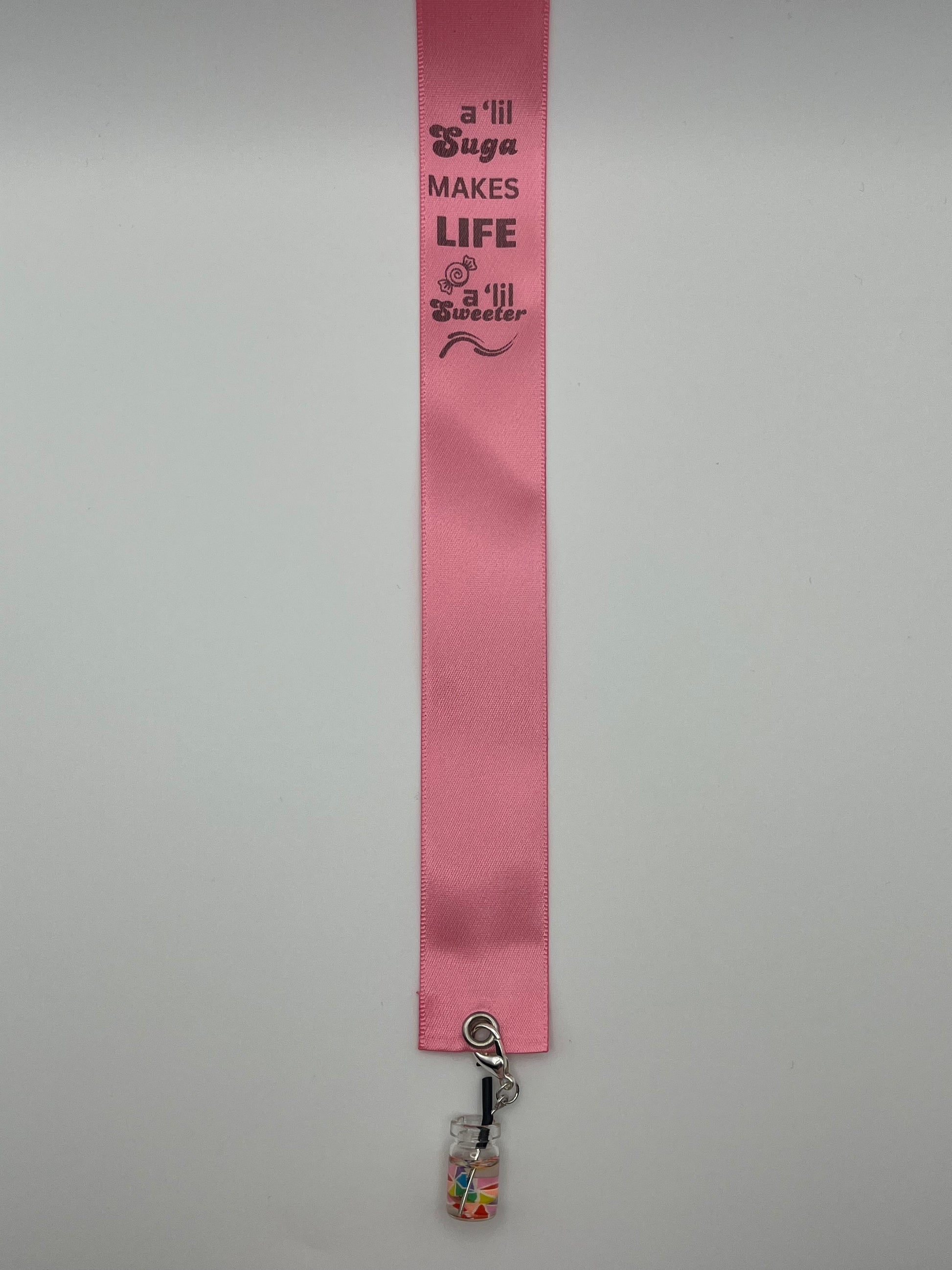 LIFE SWEETNESS – “A ‘lil suga makes life a ‘lil sweeter” - Pink Satin Reusable Adhesive Book-It™ Bookmark with a Charm (Candy Cup)