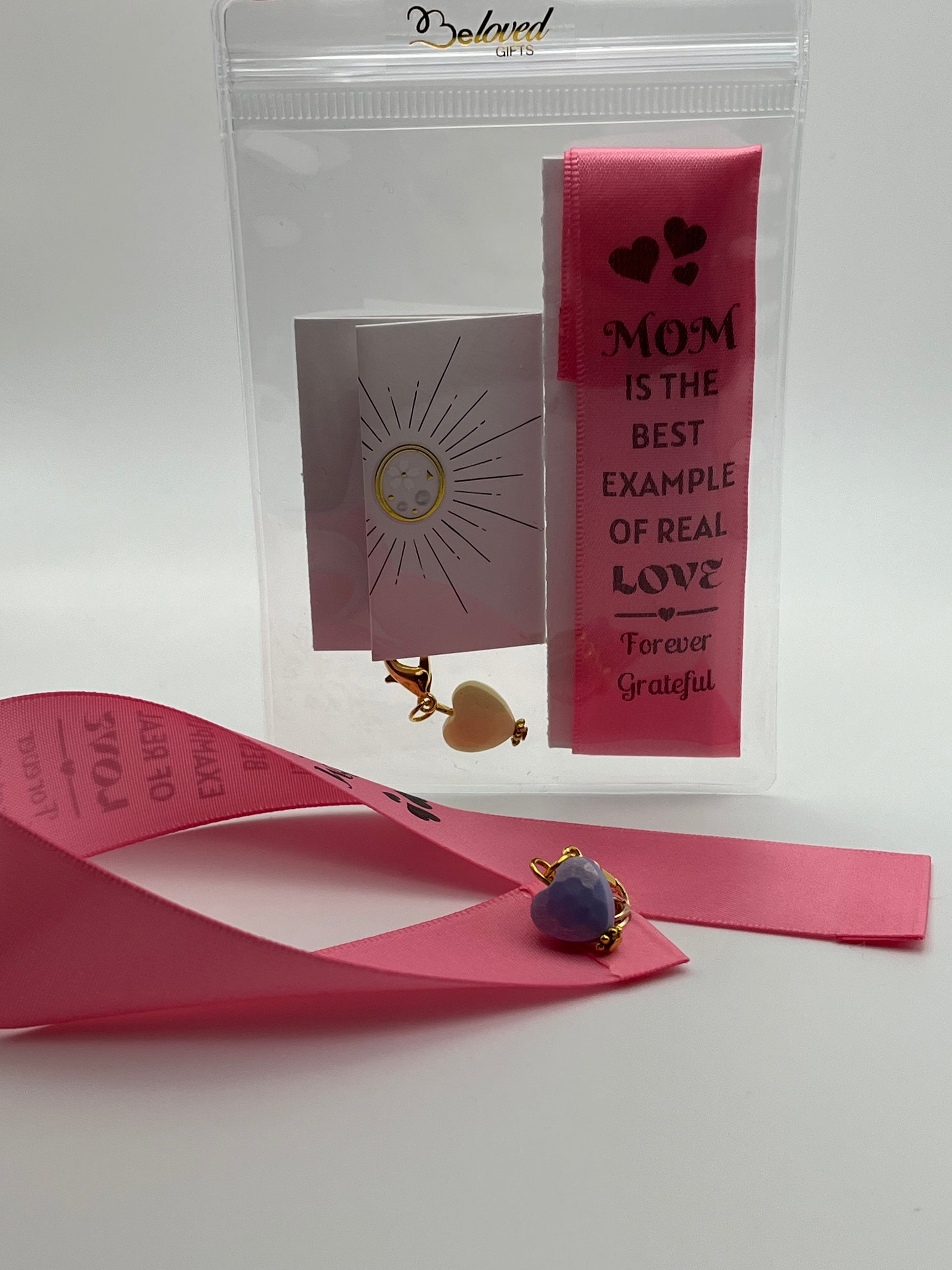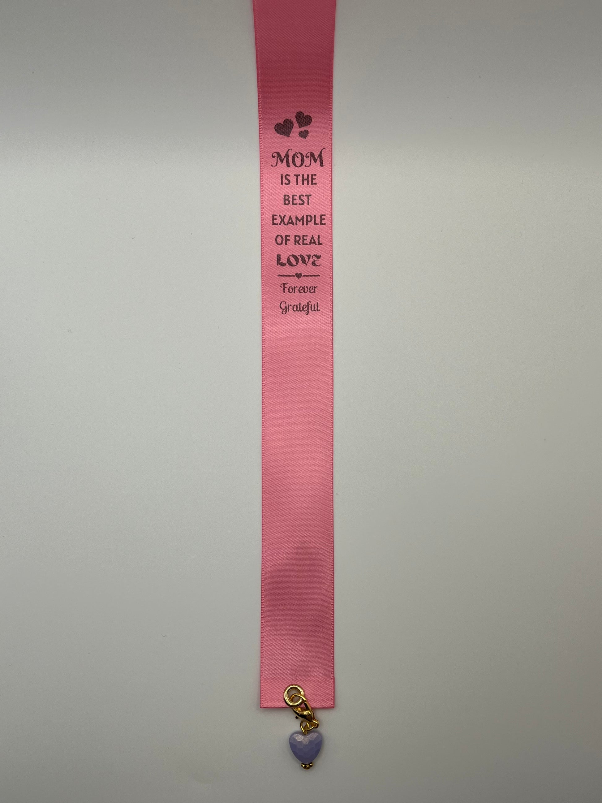 MOTHER’S DAY – “Mom is the best example of real love - forever grateful”- Pink Satin Reusable Adhesive Book-It™ Bookmark with a Charm (Coloured Heart Bead)