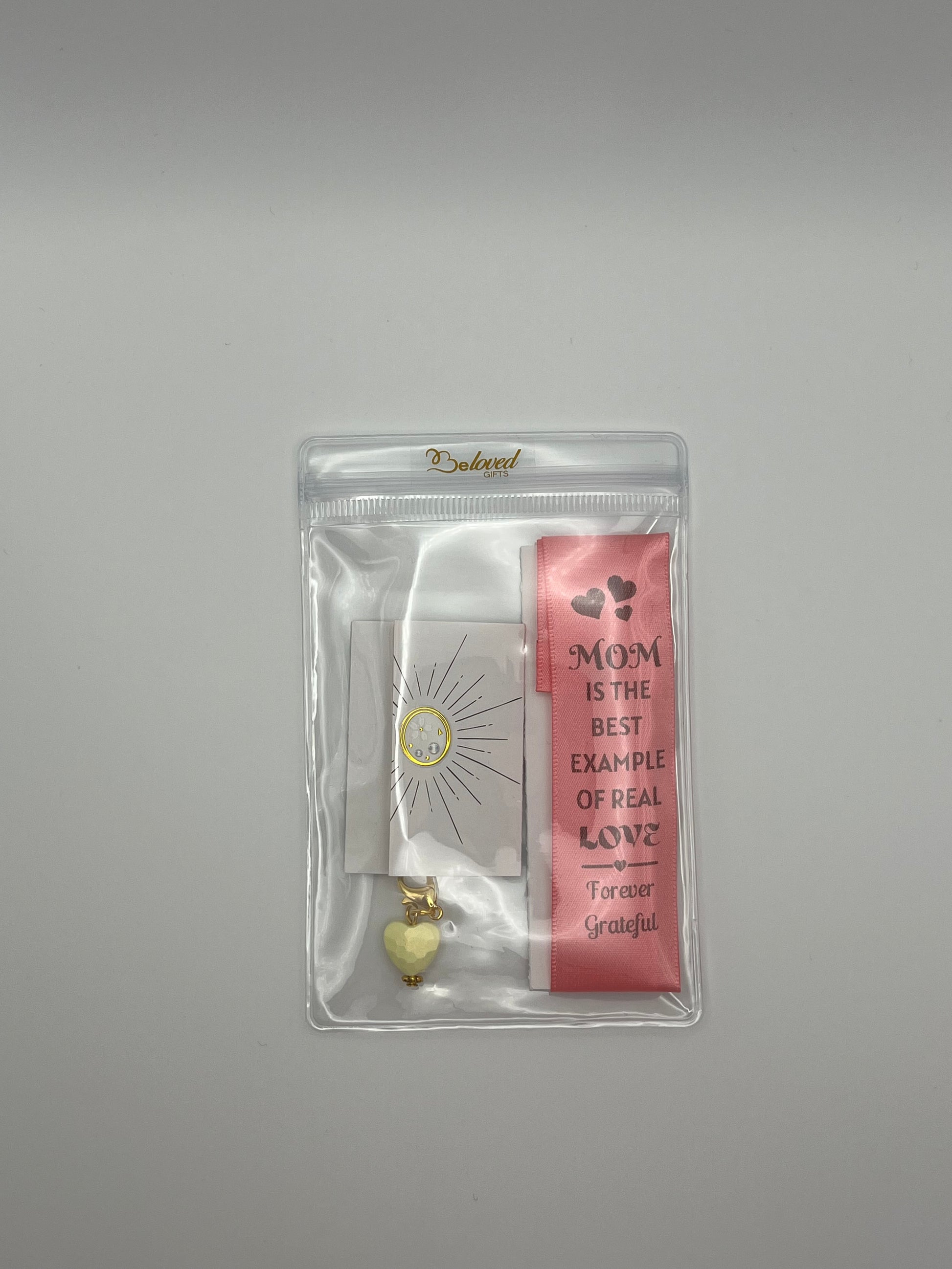 - One 25 mm/2.5 cm wide, pink single-sided luxury satin Book-It™ bookmark with a gold-coloured eyelet that says, “Mom is the best example of real love - forever grateful” written in dark grey text