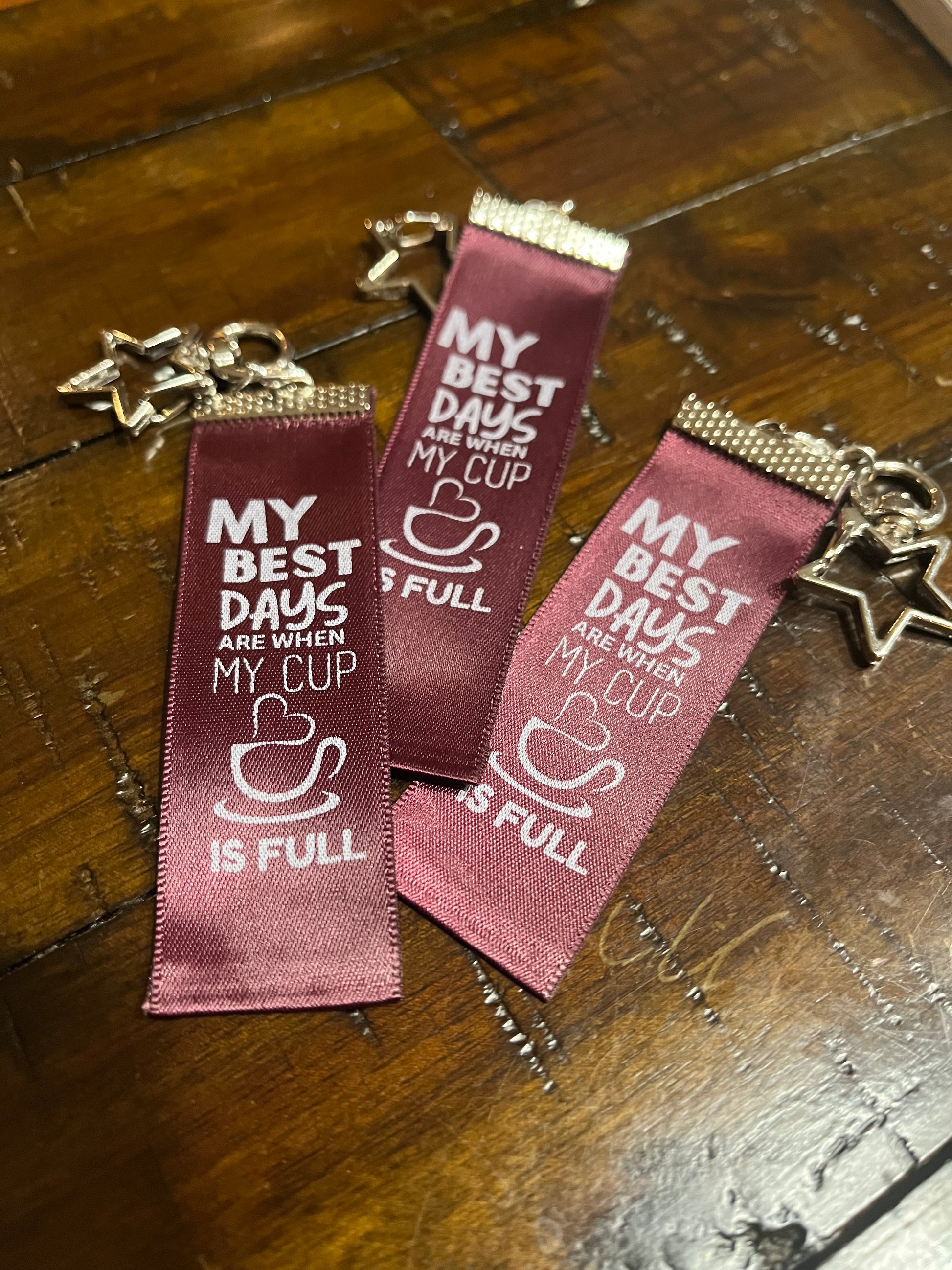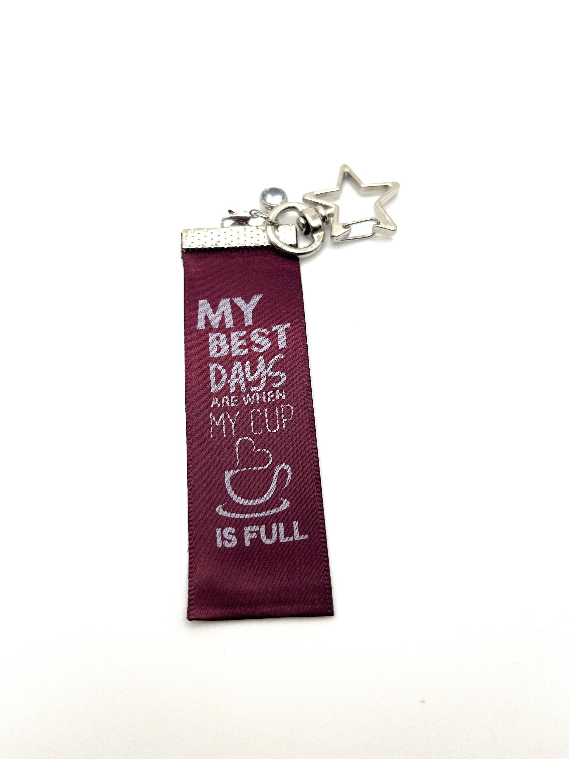 My Best Days Are When My Cup is Full – Inspirational Keychain Gift - Burgundy Ribbon with White Text - Silver Swivel Star Keyring and Gem