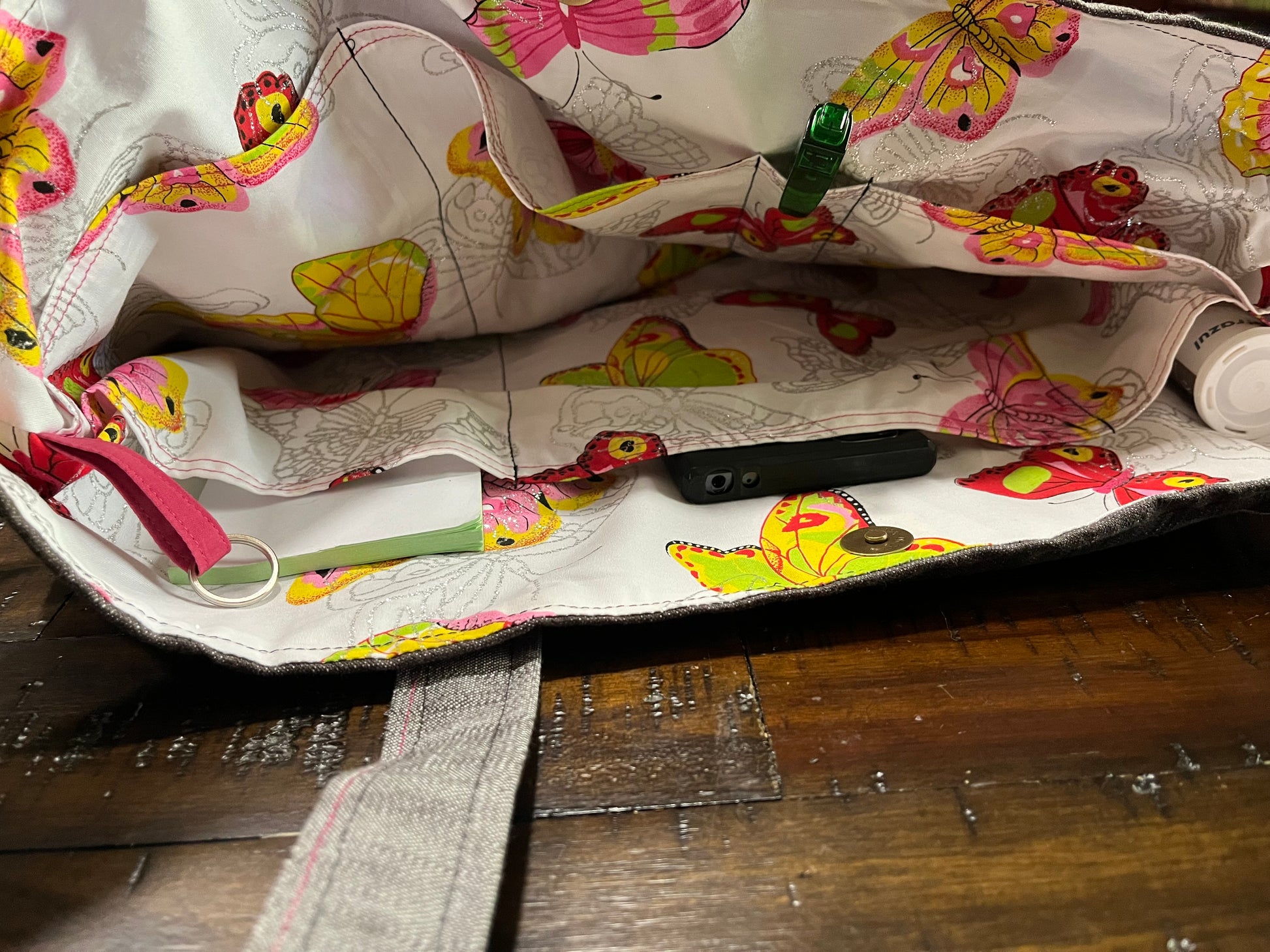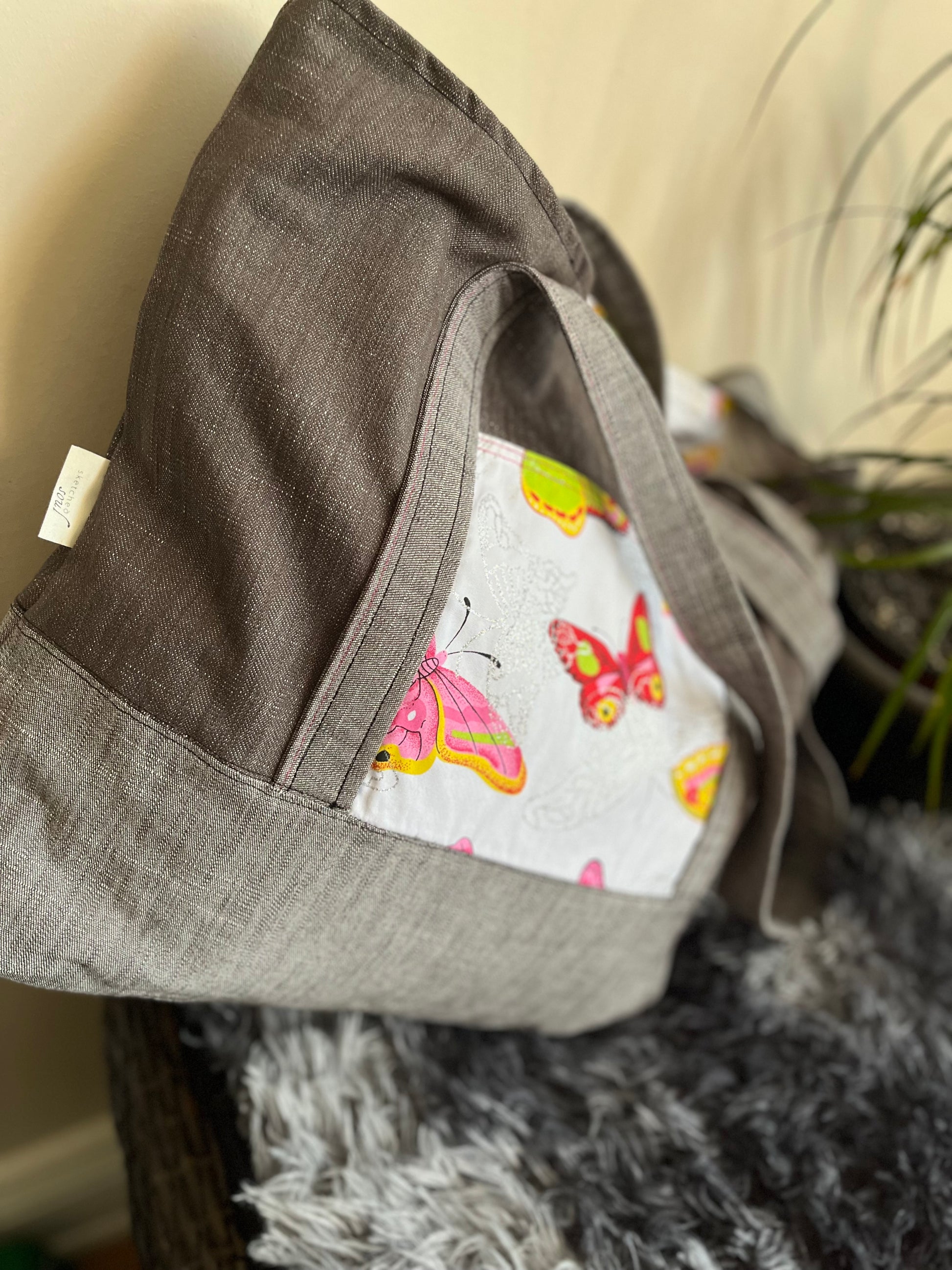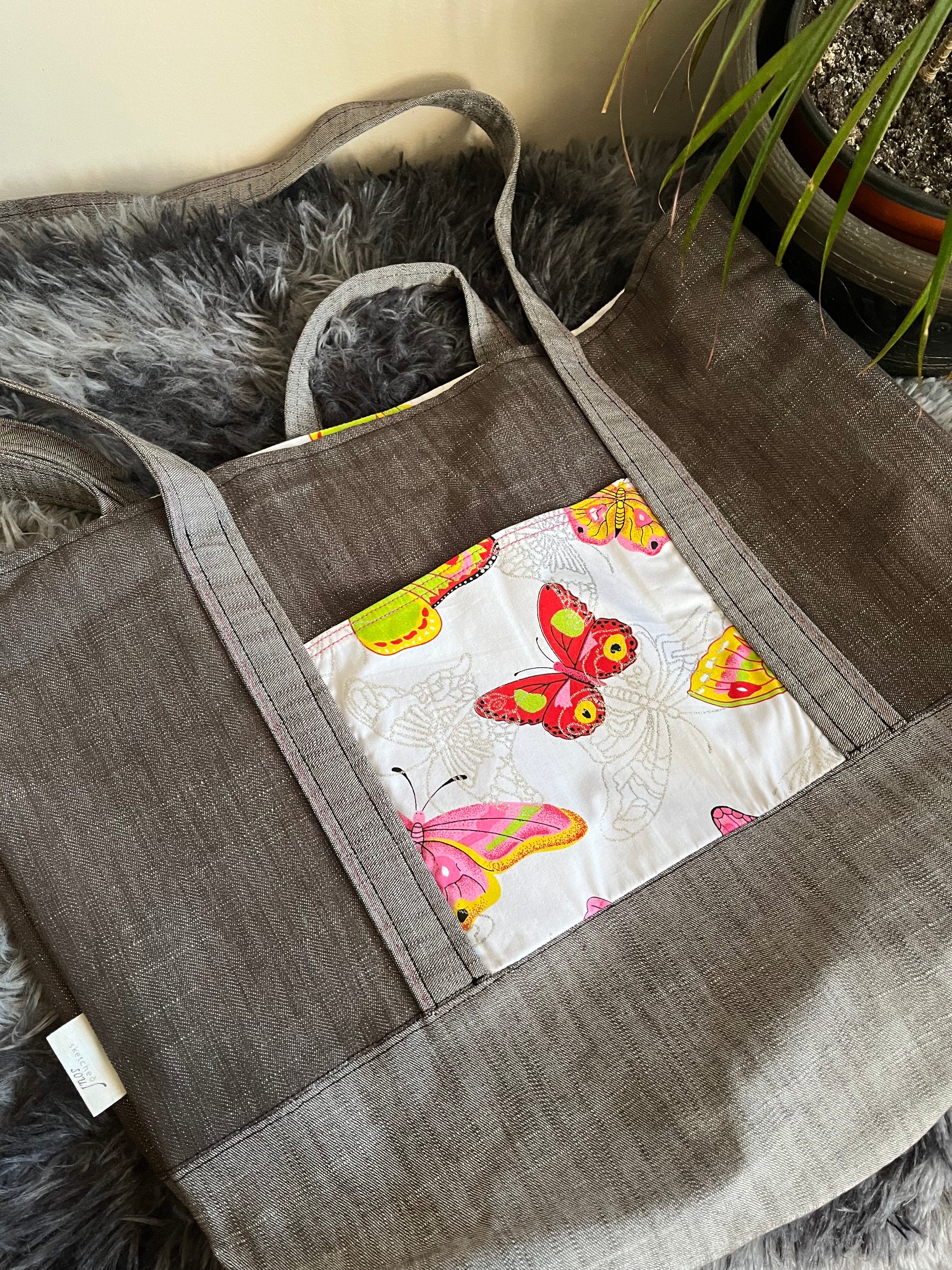 - Large Tote – Two-tone grey with butterfly print outside pocket and pink stitching on handles and pocket