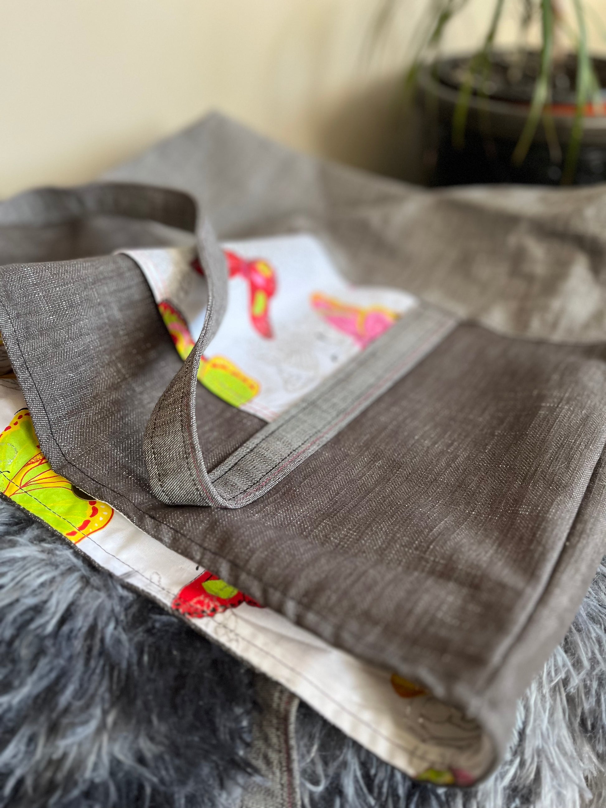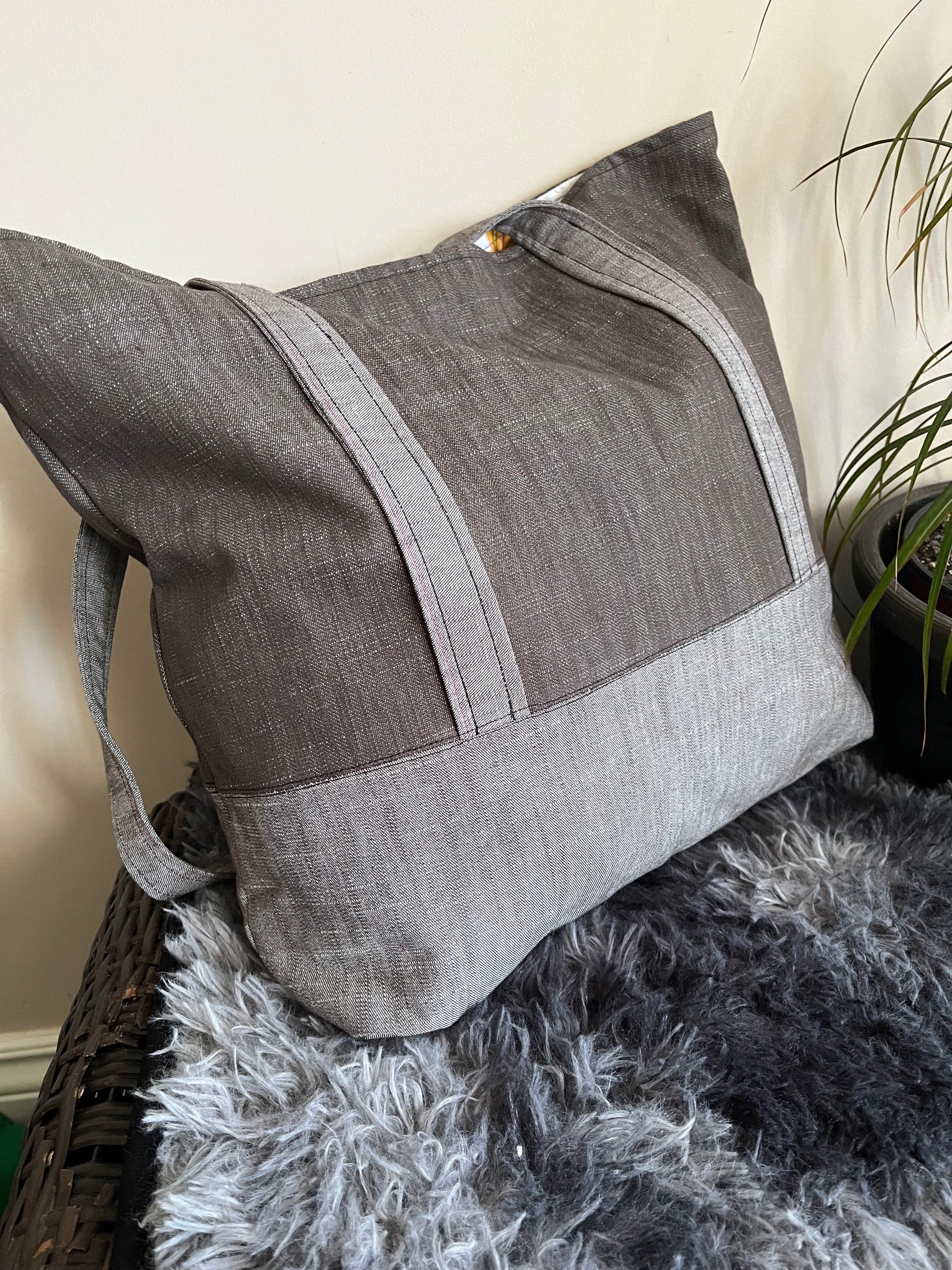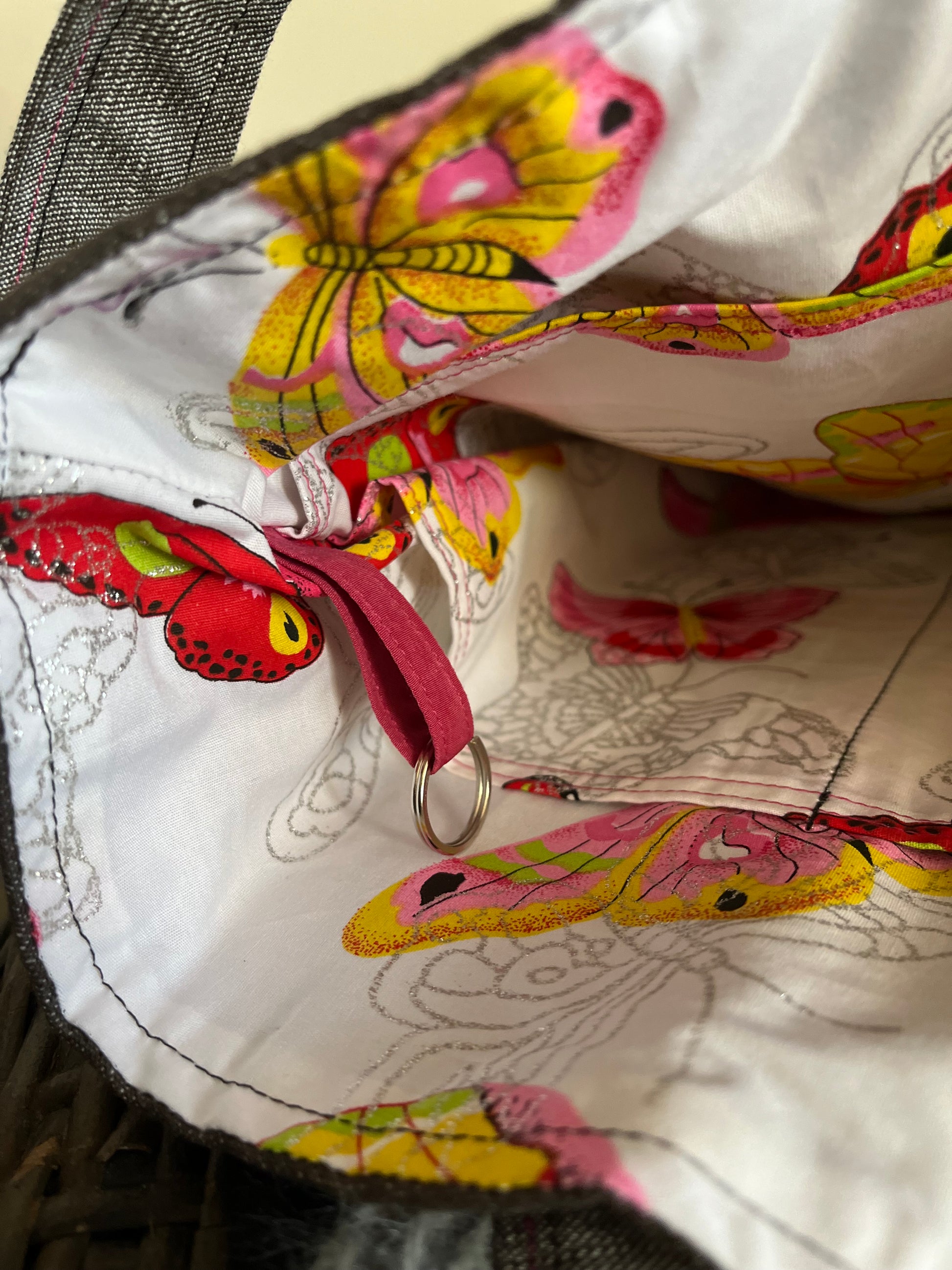 - Large Tote – Two-tone grey with butterfly print outside pocket and pink stitching on handles and pocket