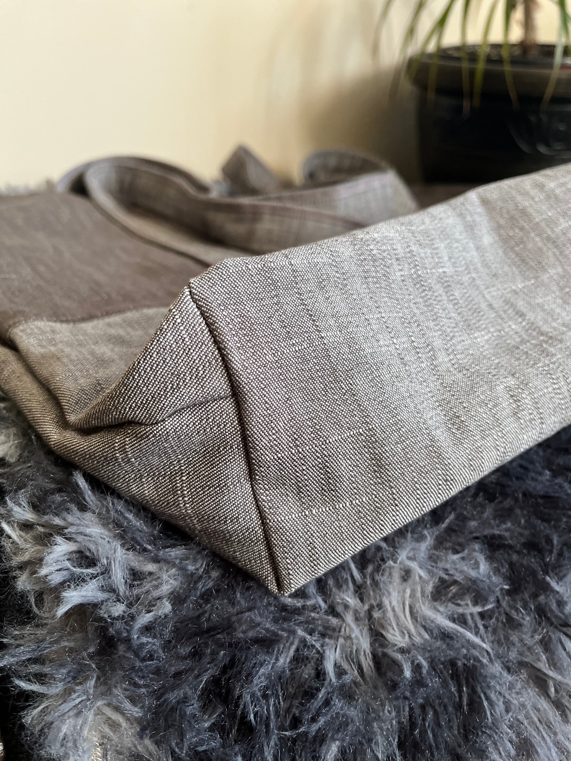 A symbol of composure with a splash of life! This beautiful two-tone grey large tote bag features a magnetic button clasp at the top, and an outside butterfly print pocket with the same print embellishing the inside lining of the bag. This one-of-a-kind tote offers a spacious interior with three pockets on one side, and another four pockets on the other side one meant specifically for a pen. It also has a keyring tab sewn inside so can have a place for your keys, worry-free. The bag straps are made with the lighter grey tone and running through them is a delicate touch of pink thread to match the butterfly print.