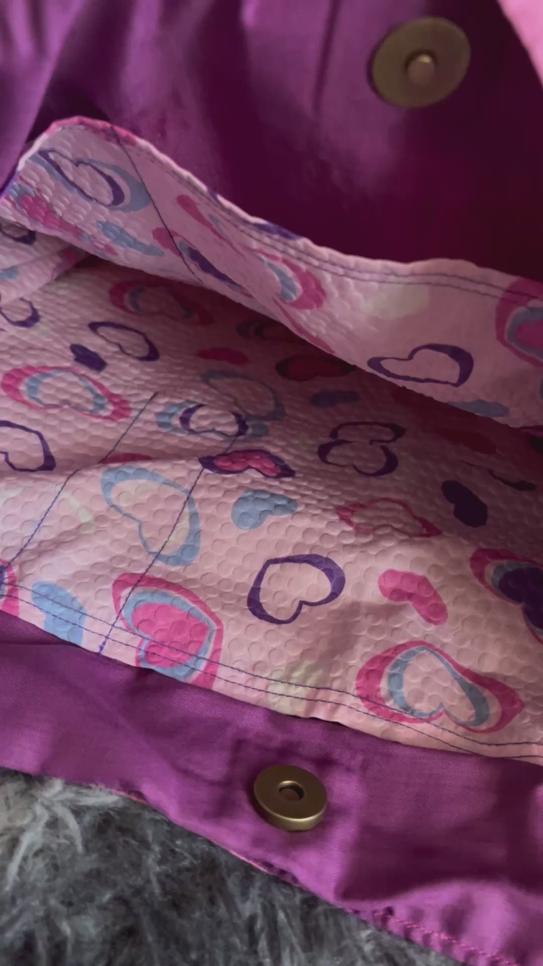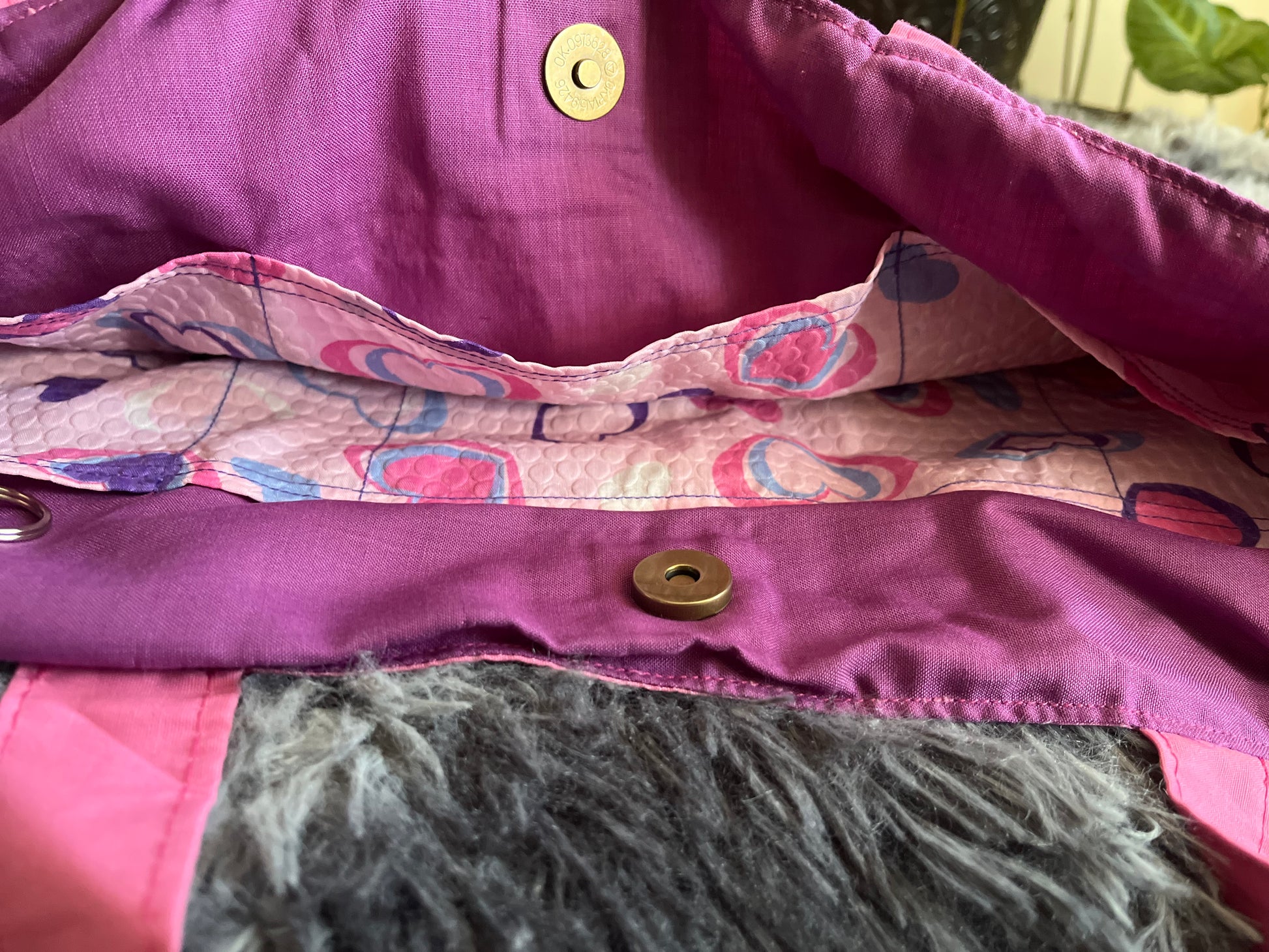 The inside of the bag is as inviting and loving as the outside. It features a magnetic clasp button at the top of the bag, with a mixed purple interior and a beautiful heart print design. The inside of the bag has many pockets. Three open pockets on one side – big enough to hold a phone, along with another on the other side, plus one for a pen. This bag also has a key ring, which allows you to safely store your keys without worrying about losing them as you’re out and about.