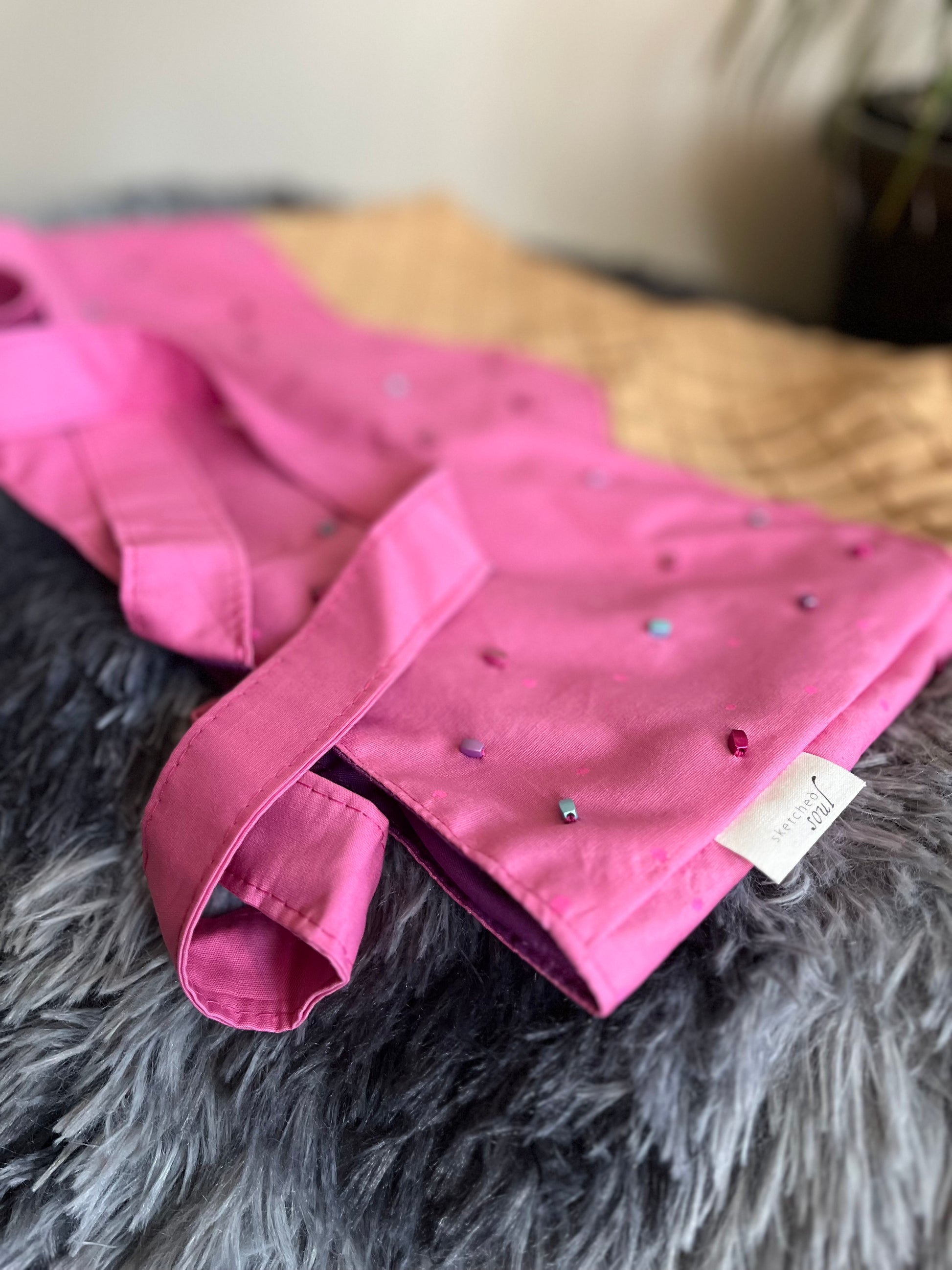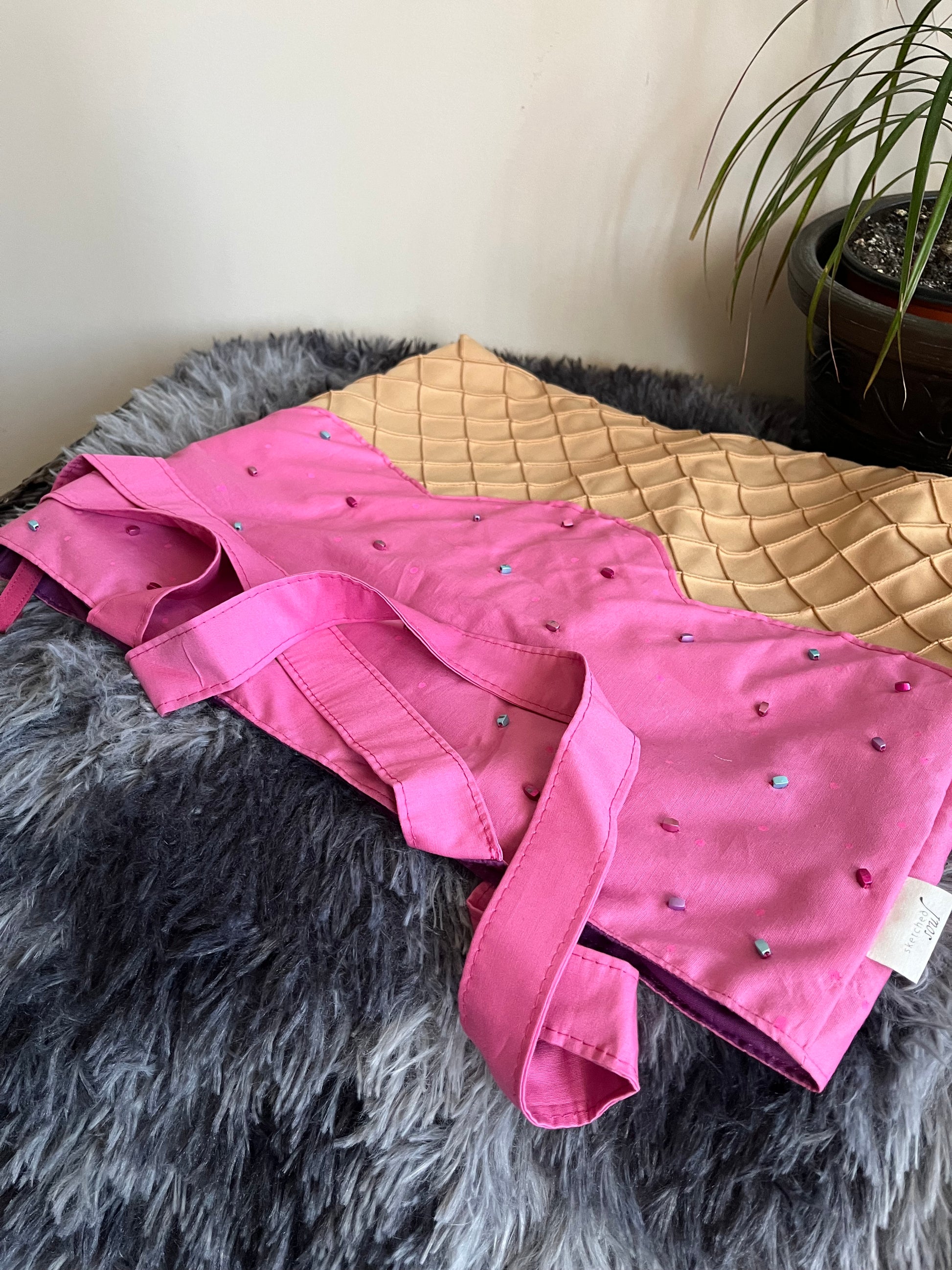 The perfect tote for someone sweet! This ice cream-designed, unique tote bag offers a stunning textured experience. The lower half features a thick luxurious waffle print fabric, while the upper half has a softer, bright pink fabric, with scattered beads for that perfect sprinkle look.